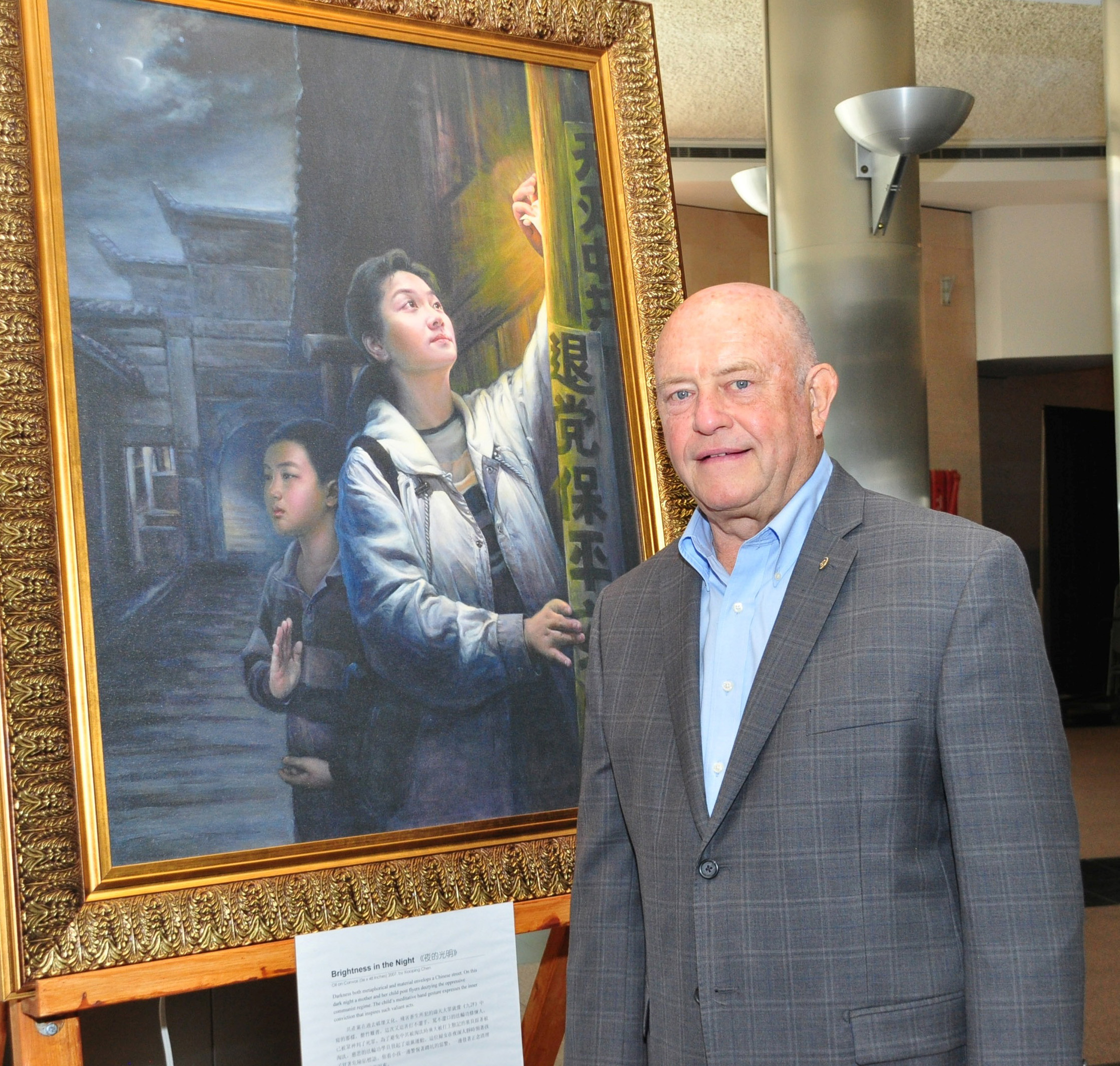 油画《夜的光明》描绘在中国大陆,一名妇女在夜晚领着孩子,冒险贴法轮功真相标语,标语发出的光芒照亮了她的脸。密西沙加市议员Ron Starr说,那夜晚的背景衬托出她所看到的希望之光,“非常非常打动人。”