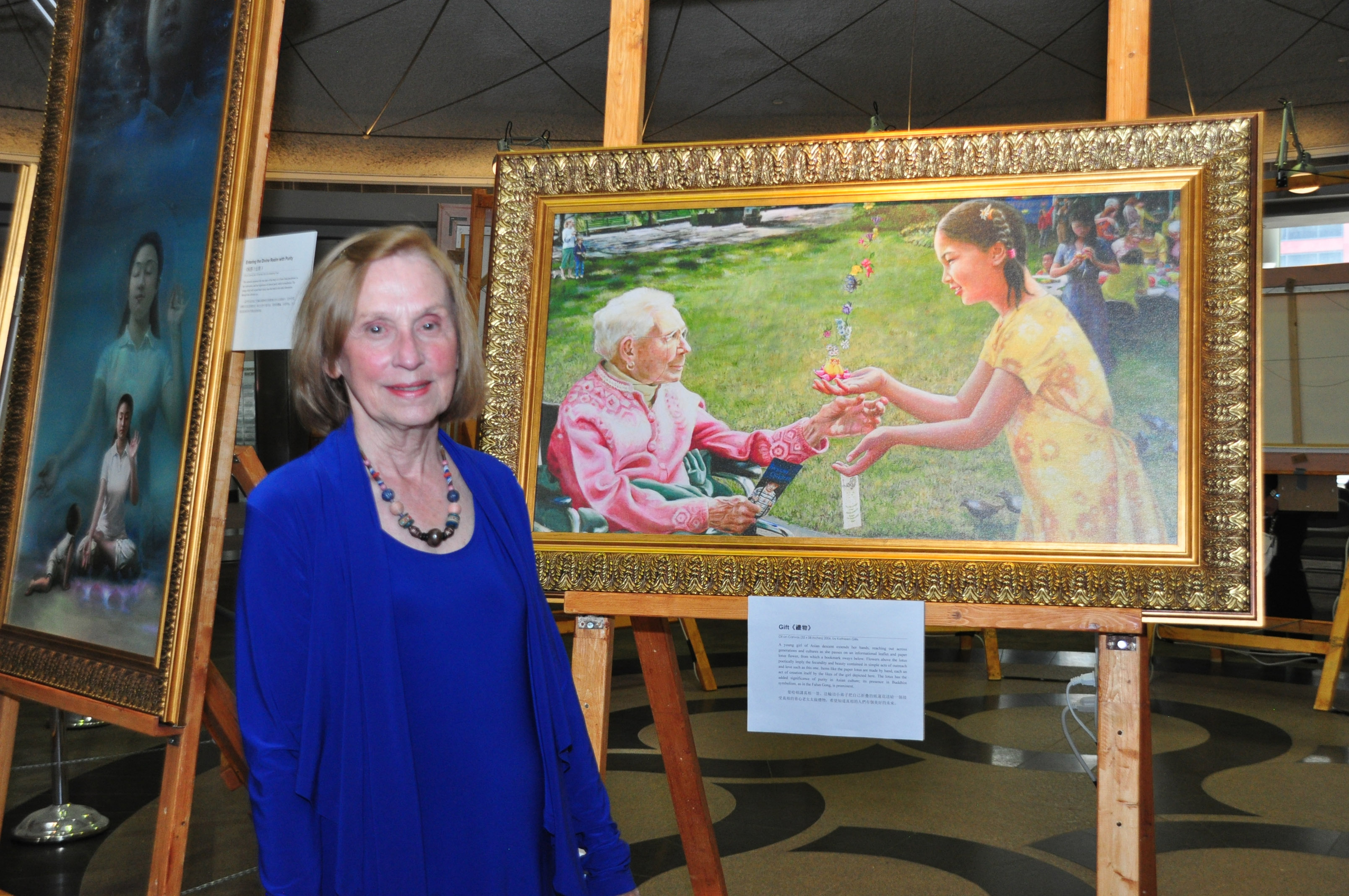 《礼物》展现的是一位年轻的法轮功学员把纸莲花送给一位年迈的长者,她的脸上充满了祥和与祝福,莲花里不断升出各种美丽的花。这是加拿大画家Kathleen Gillis的作品。她说:“我理解这是一份特殊的礼物,人们总有一天会明白这礼物的真意。”