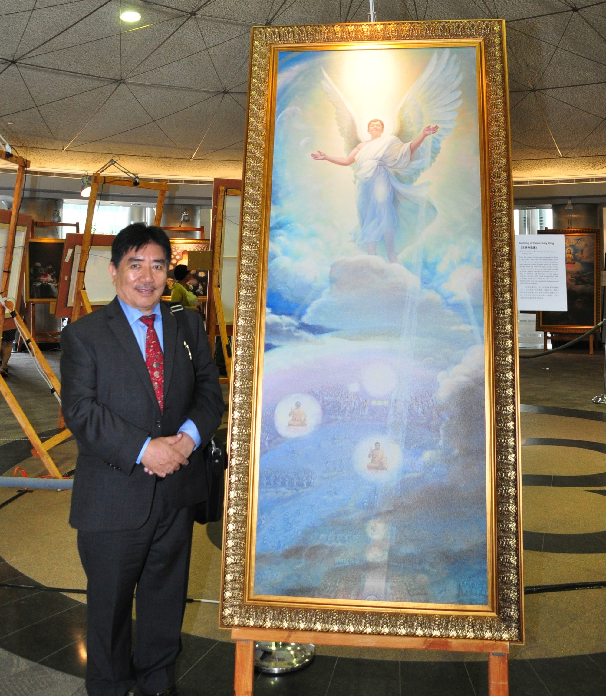 加拿大西藏之友共同主席Kunga Tsering对描绘主佛降临的画作特别感兴趣。他说,从上至下,从非常明亮逐渐变暗,展示佛的慈悲,从高层世界到底层世界,“很具启迪性,非常好。”