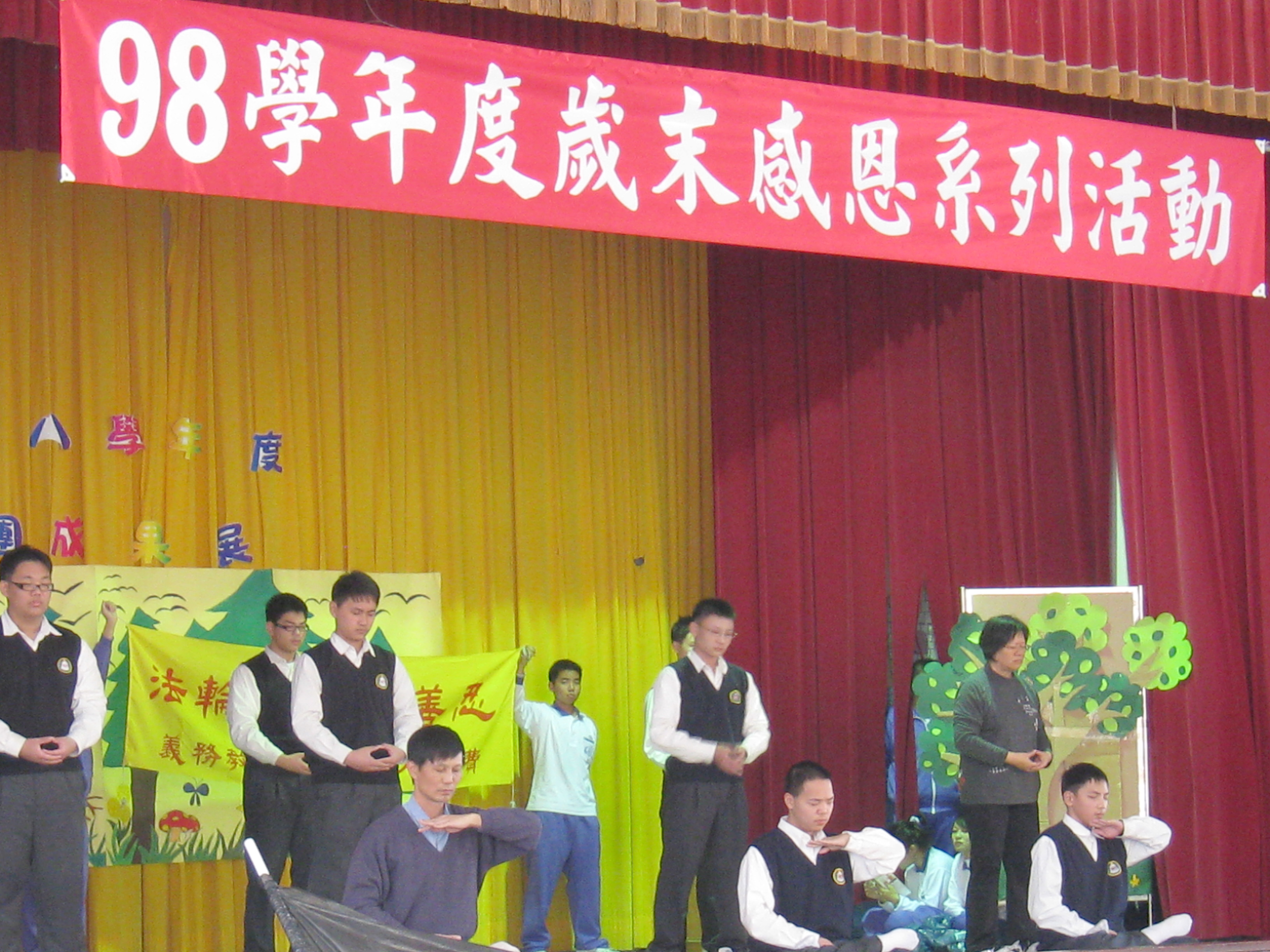 ![]() 图3: 廖校长(前排左一)与学生在岁末感恩系列活动上,举行社团成果发表会并表演功法。 |