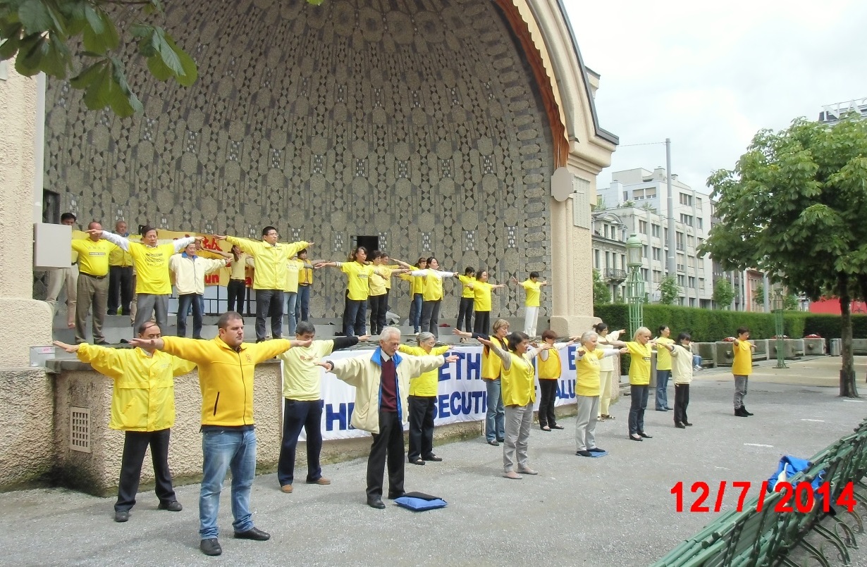 ![]() 法轮功学员在瑞士旅游胜地卢塞恩的湖边露天音乐厅集体炼功 |