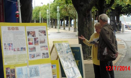卢塞恩是瑞士的一座著名旅游城市,每年都会有大批来自中国大陆的旅游者来此参观游玩。二零零四年大.纪.元;发表《·九·评*共产党》并引发三:退.大潮之后,为了更好地向大陆民众传“·九·评*”、劝“三:退.”,瑞士学员在这里开展了讲真相活动。其中年过七旬的法轮功学员潘女士,十年来克服种种困难,一直坚持不懈地在这里讲真相、劝三:退.。二零零八年至今,仅她一人劝三:退.的人数就已超过了五万。