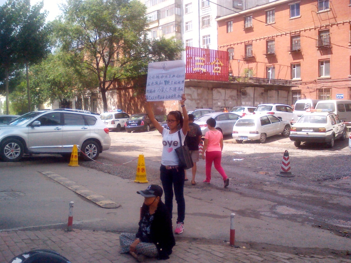 下午,张海霞的女儿和张海霞年近八十的老母亲就到香坊分局举牌。在烈日炎炎下,一老一小,女儿打着牌子,老人因女儿女婿被绑架,几天的奔波找人无果的情况下疲惫地瘫坐在地上。