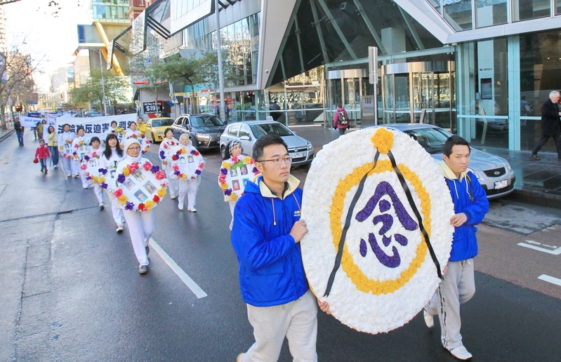 一对从阿德莱德来墨尔本旅游的夫妇看到游行后,妻子在不停地抹眼泪,她说:“真善忍这是多么美好的信仰,怎么会受到迫害,我们还想了解更多的信息。”