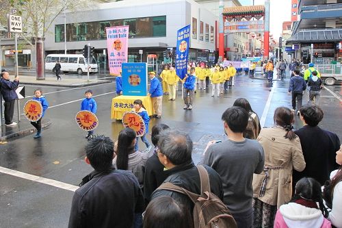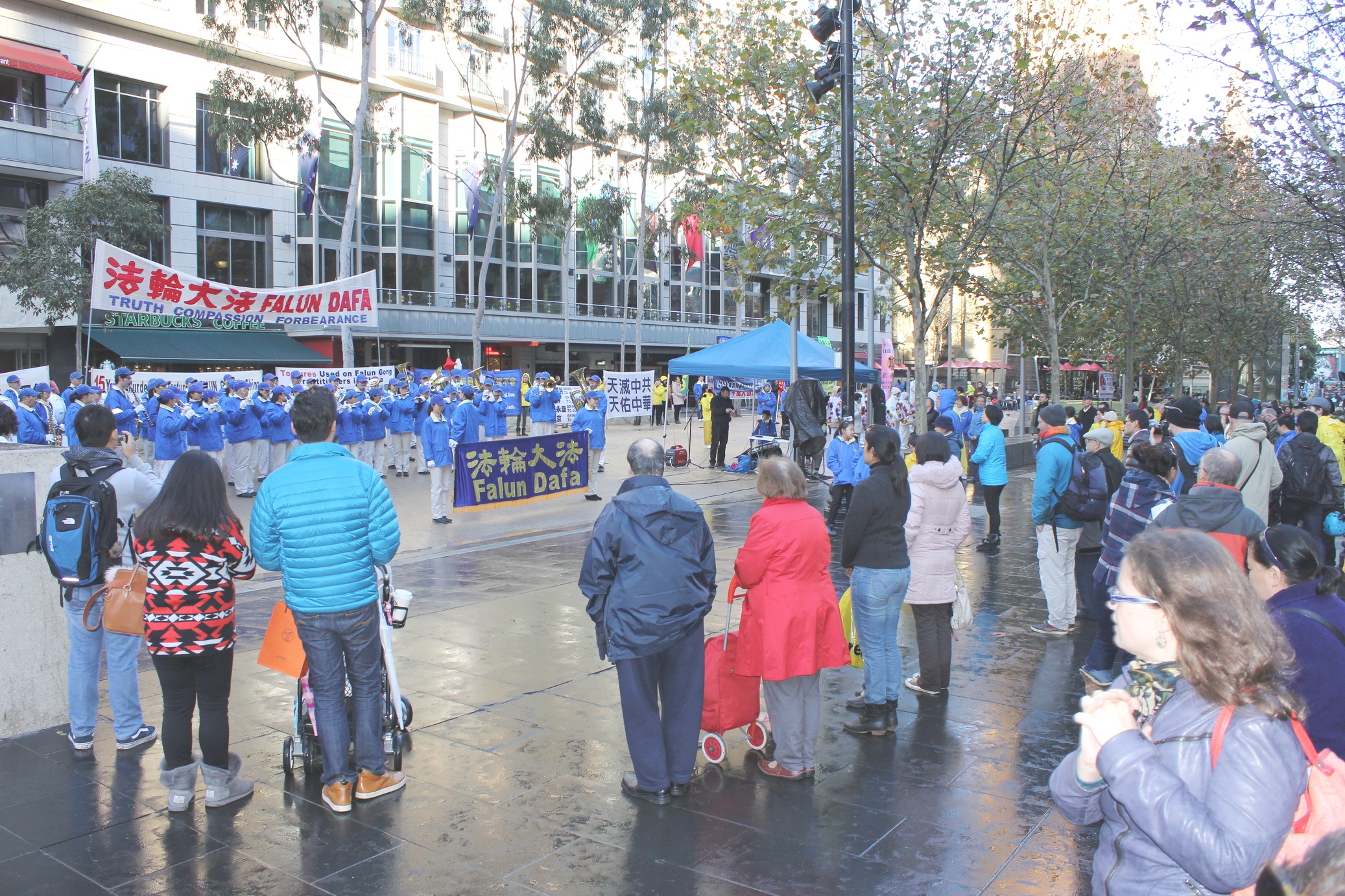 在集会过程中,不时穿插着天国乐团的演奏和文艺表演。音乐剧《回归的旅程》,展现了法轮功学员从得法修炼,七二零后去天安门上访遭受关押到坚持不懈和平反迫害的历程;大法小弟子安心的歌唱嘹亮清澈,吸引了不少行人停下脚步,用心聆听。澳洲民众了解真相后,都在征签表上签名反迫害。