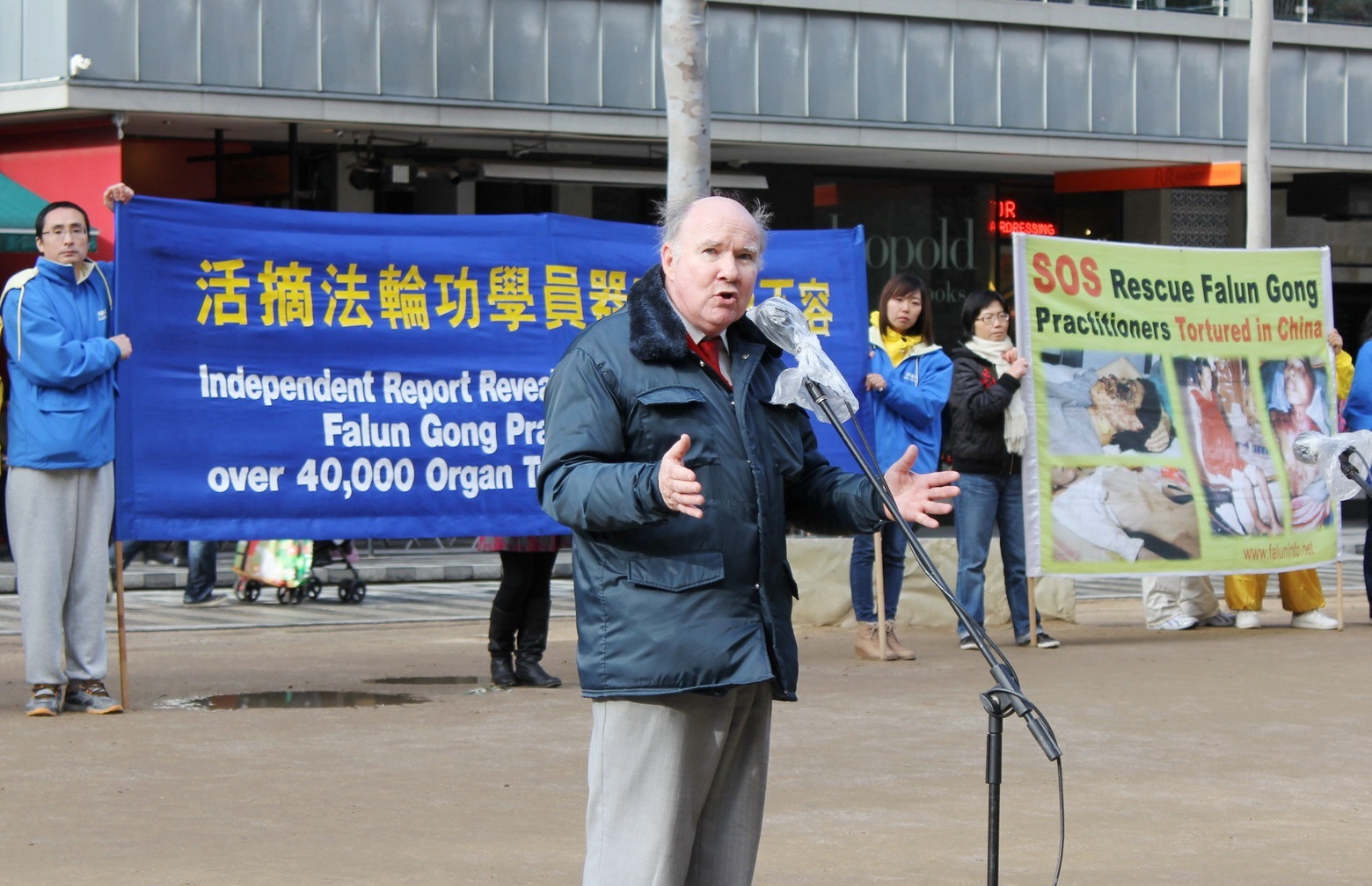 ![]() 图9:澳洲全国公民委员会主席彼得•维斯特摩尔(Peter Westmore)在法轮功反迫害集会上发言 |