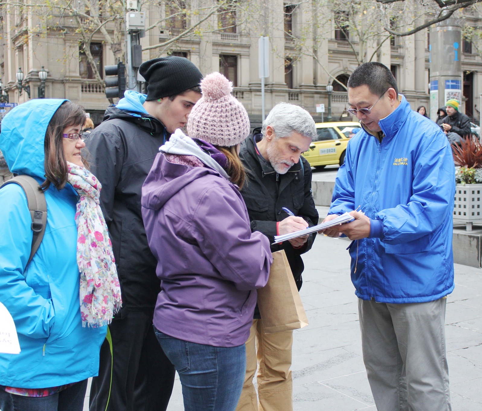 来自德国的布维妮可(Buervenich)女士已经在墨尔本工作了几年,她听说法轮功学员被中共活体摘取器官非常震惊,立即在反迫害征签表上签了名。