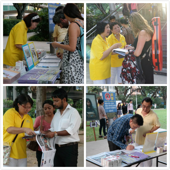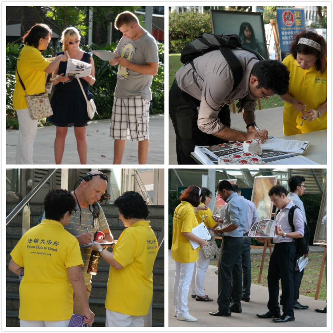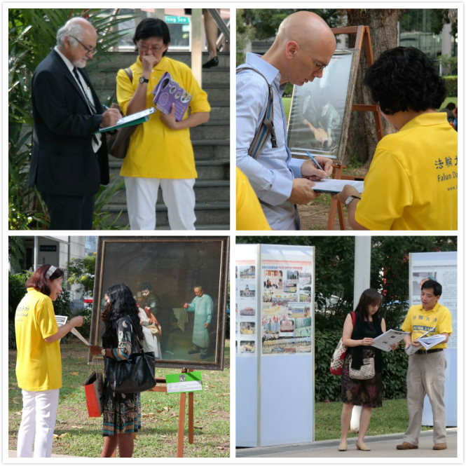 人们对迫害的残暴感到震惊和悲痛,强烈表示必须终止这场惨无人道的迫害,并纷纷支持学员们为反迫害所做的努力,鼓励学员们坚持做下去,同时赞扬当天的活动非常成功。有近二百人在反对中共强摘器官的征签表上签名。还有了解真相后的中国人,不但签名支持反迫害,还现场声明三:退.。一对新加坡少女Rebecca和Priya被法轮功学员的集会场景所深深震撼。她们感叹:“难得有这么多新加坡人站出来抗议,表达自己的意愿!”“杀人、强摘器官是反人类的恶行。”多位法律界人士也纷纷签名反对强摘器官,其中一人说:“希望多一个签名能够多一份帮助!”