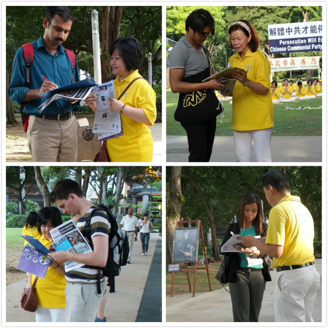 当天,大批新加坡民众接连不断地来到活动现场。三名年轻教师在了解了中共活摘器官的罪行后,很乐意在联署书上签名。其中一位教师Gill说,活摘器官是灭绝人性的,是不道德的,身为人类都应该反对。七十四岁的理发师吴先生专程从女皇镇赶来支持学员们的活动。他表示,是从《大.纪.元;时报》上了解到法轮功学员举办反迫害活动的,法轮功有益身心,迫害的元凶江泽民应受到法律的追究。