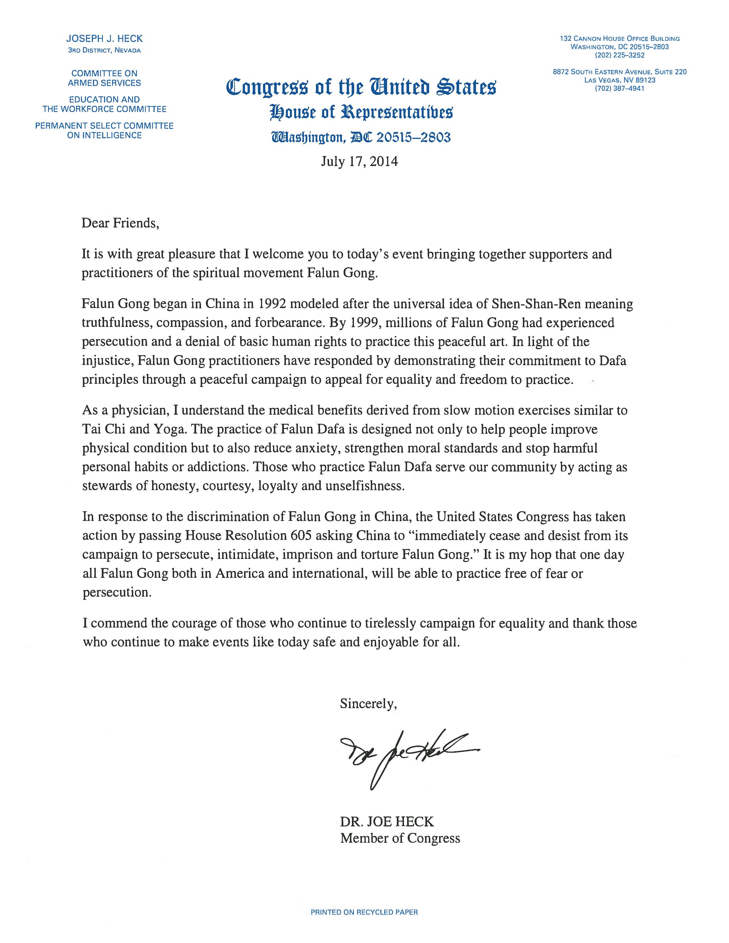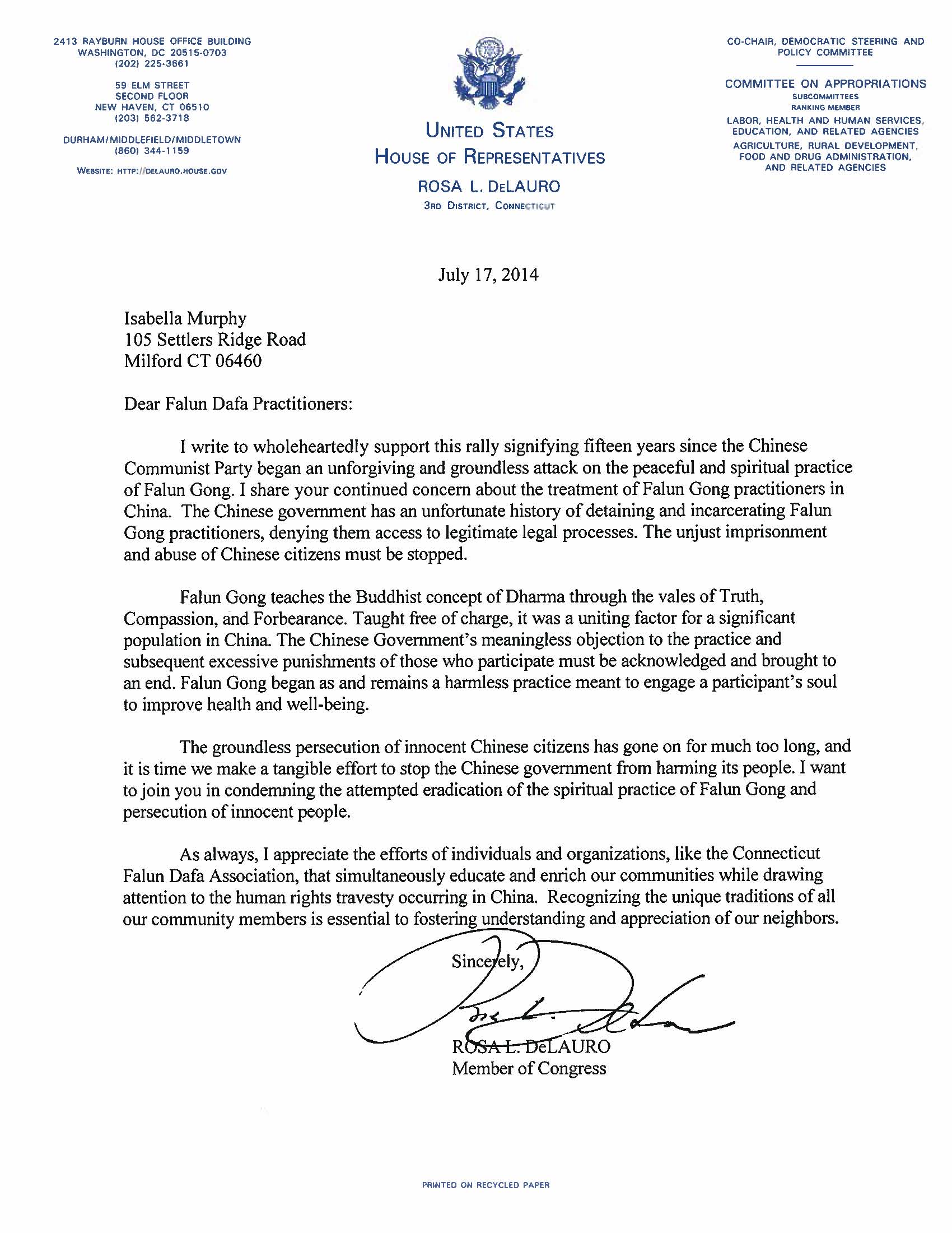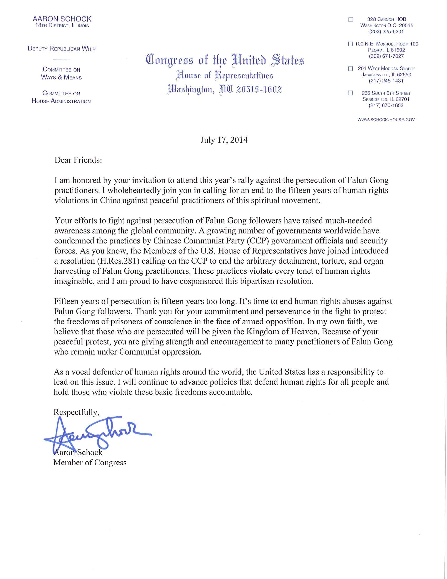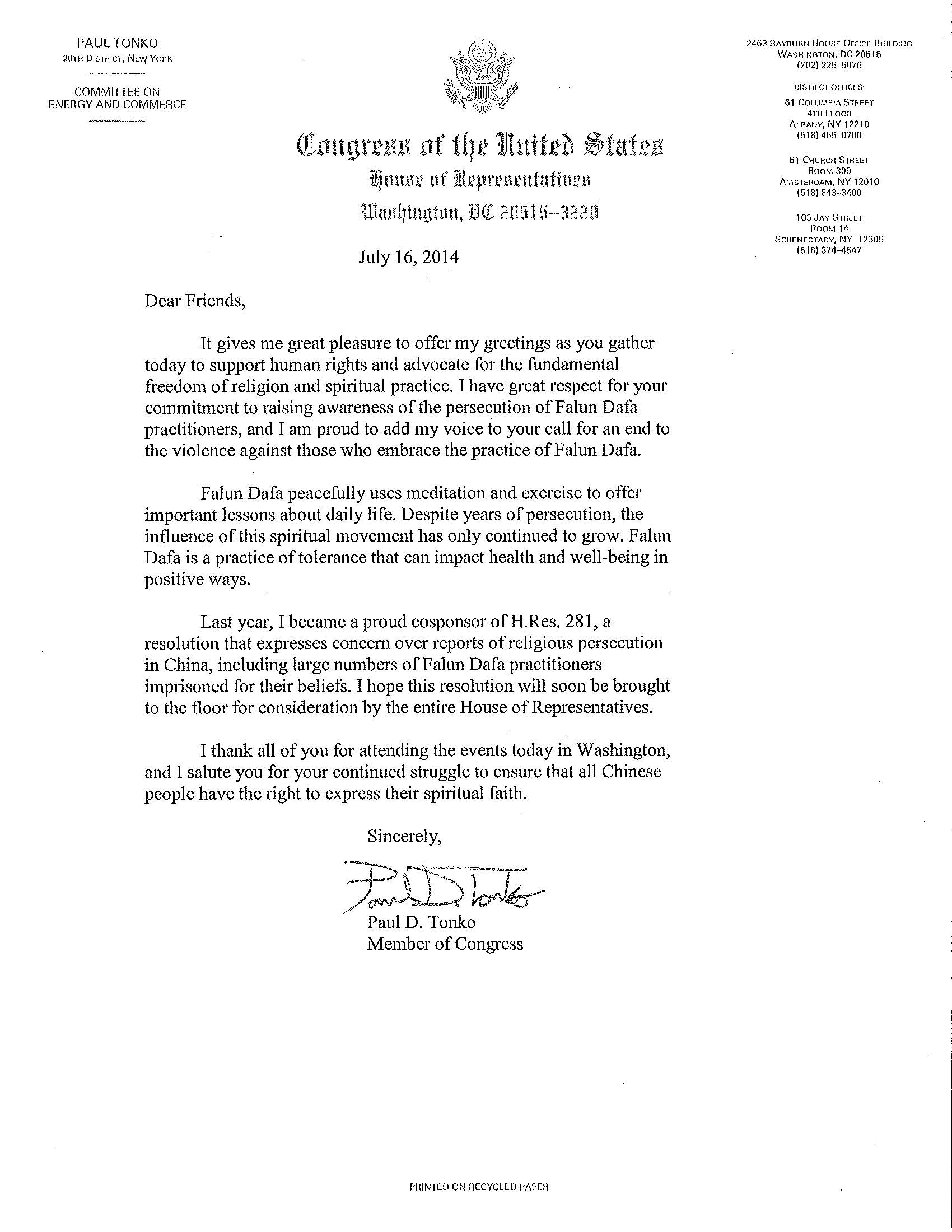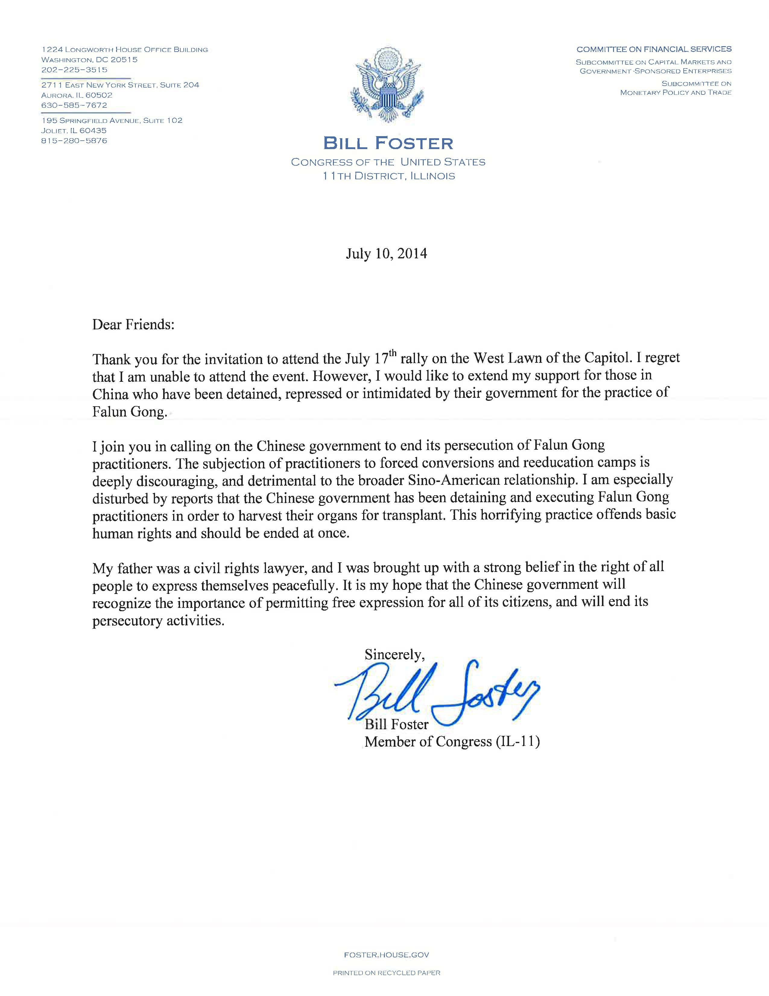 二零一四年“七•二零”前夕,多位美国国会参、众议员致函法轮功学员,他们在信中说:“十五年的迫害时间太长,现在是结束对法轮功修炼者的人权迫害的时候了”,并表示与法轮功学员一道,要求中共停止迫害法轮功。