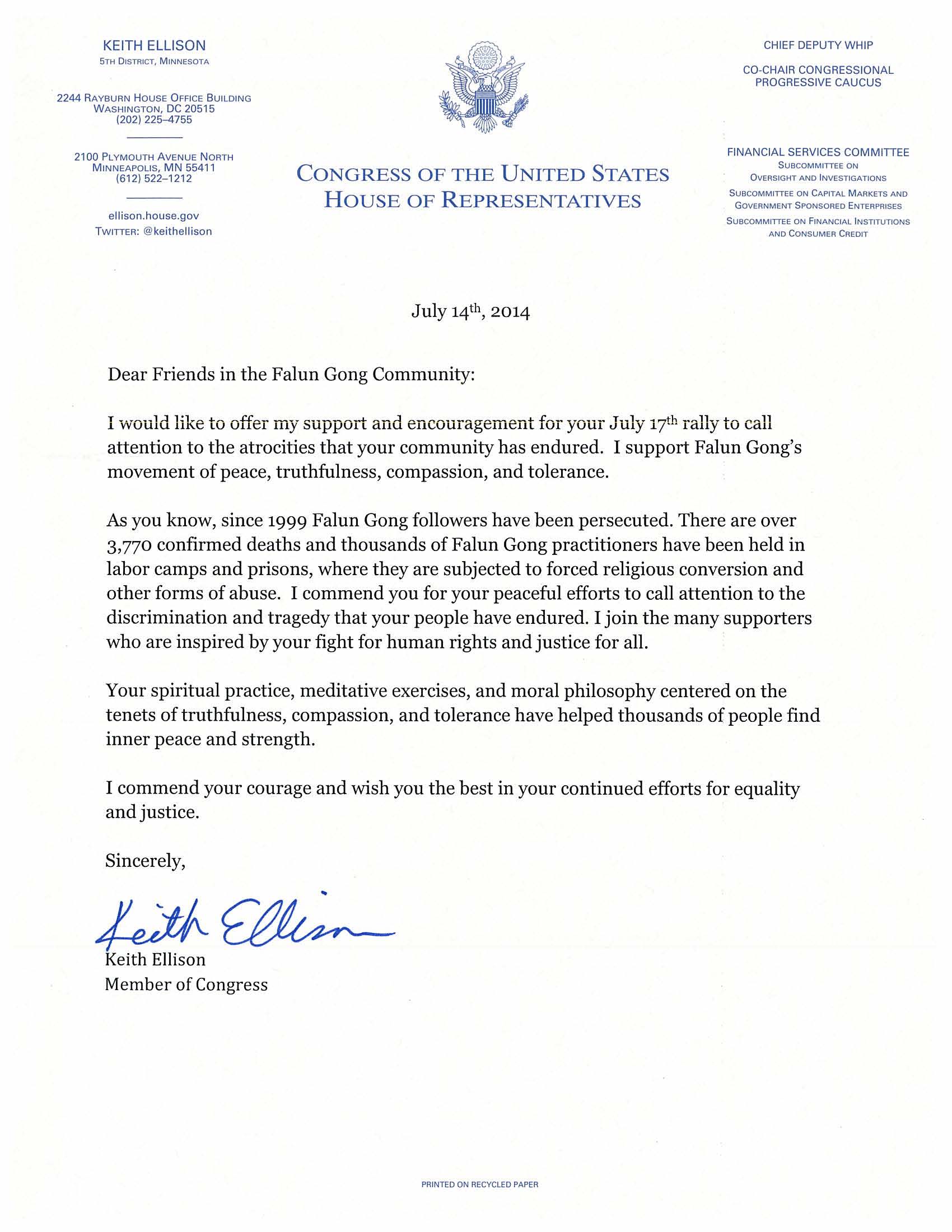 ![]() 明尼苏达州国会众议员基斯•埃利森(Keith Ellison) | ![]() 明尼苏达州国会众议员基斯•埃利森(Keith Ellison)的信函 |
