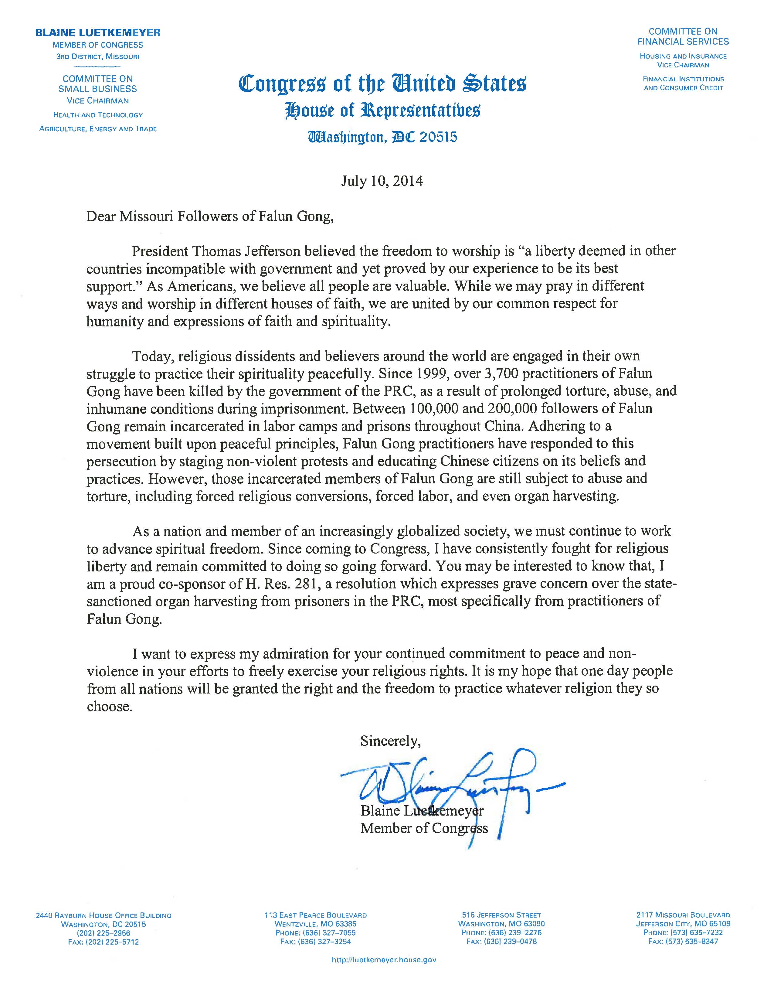![]() 密苏里州联邦众议员布莱因•路克迈尔(Blaine Luetkemeyer) | ![]() 密苏里州联邦众议员布莱因•路克迈尔(Blaine Luetkemeyer)信函 |