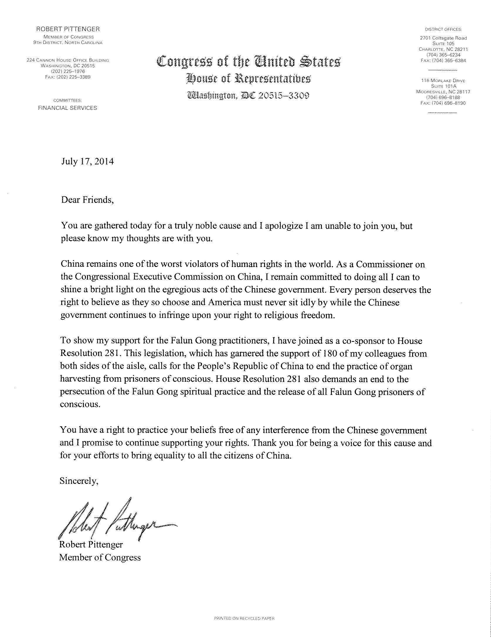 ![]() 北卡罗来纳国会众议员罗伯特•皮滕杰 (Robert Pittenger) | ![]() 北卡罗来纳国会众议员罗伯特•皮滕杰 (Robert Pittenger)的信函 |