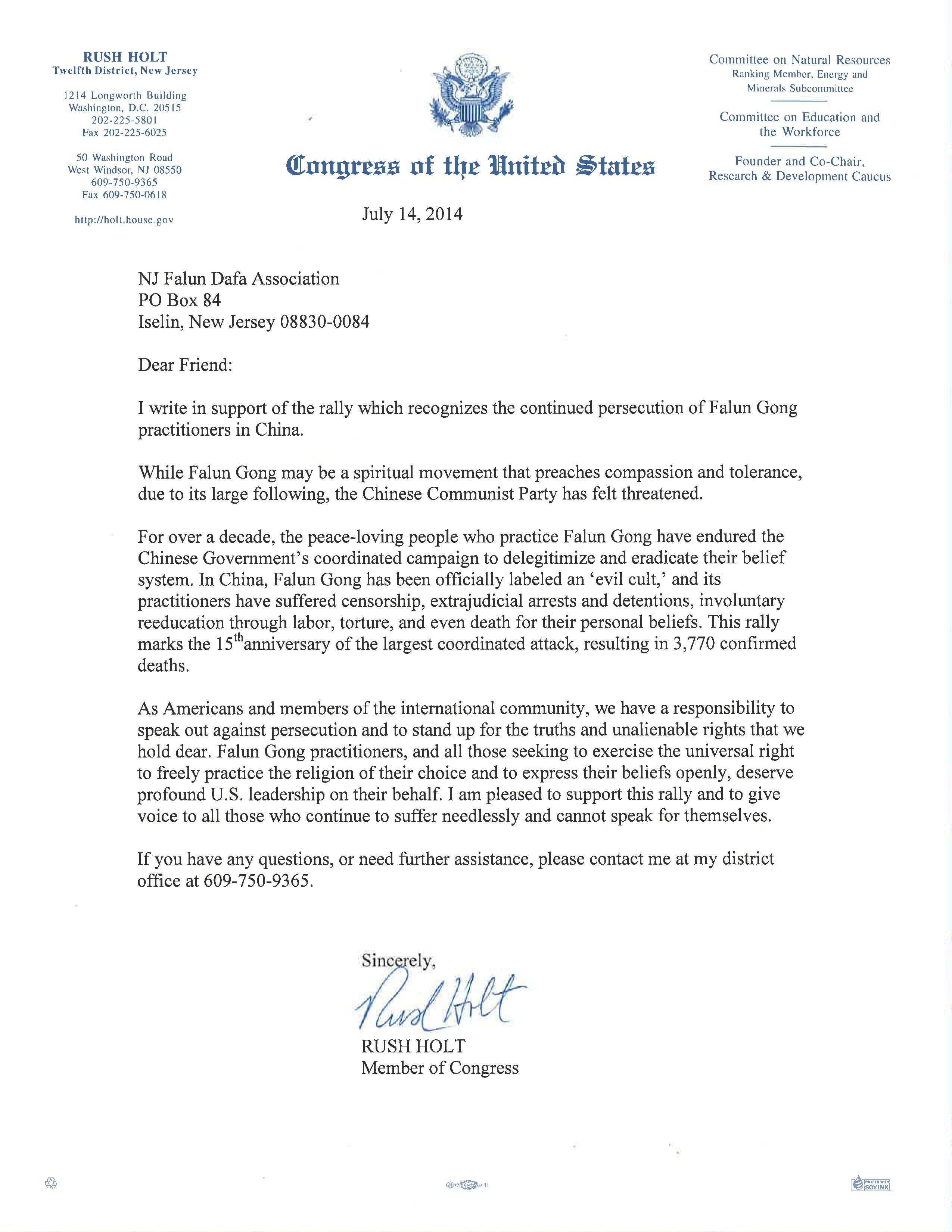 ![]() 新泽西州国会众议员拉什•霍特(Rush Holt) | ![]() 来自新泽西州国会众议员拉什•霍特(Rush Holt)的信函 |