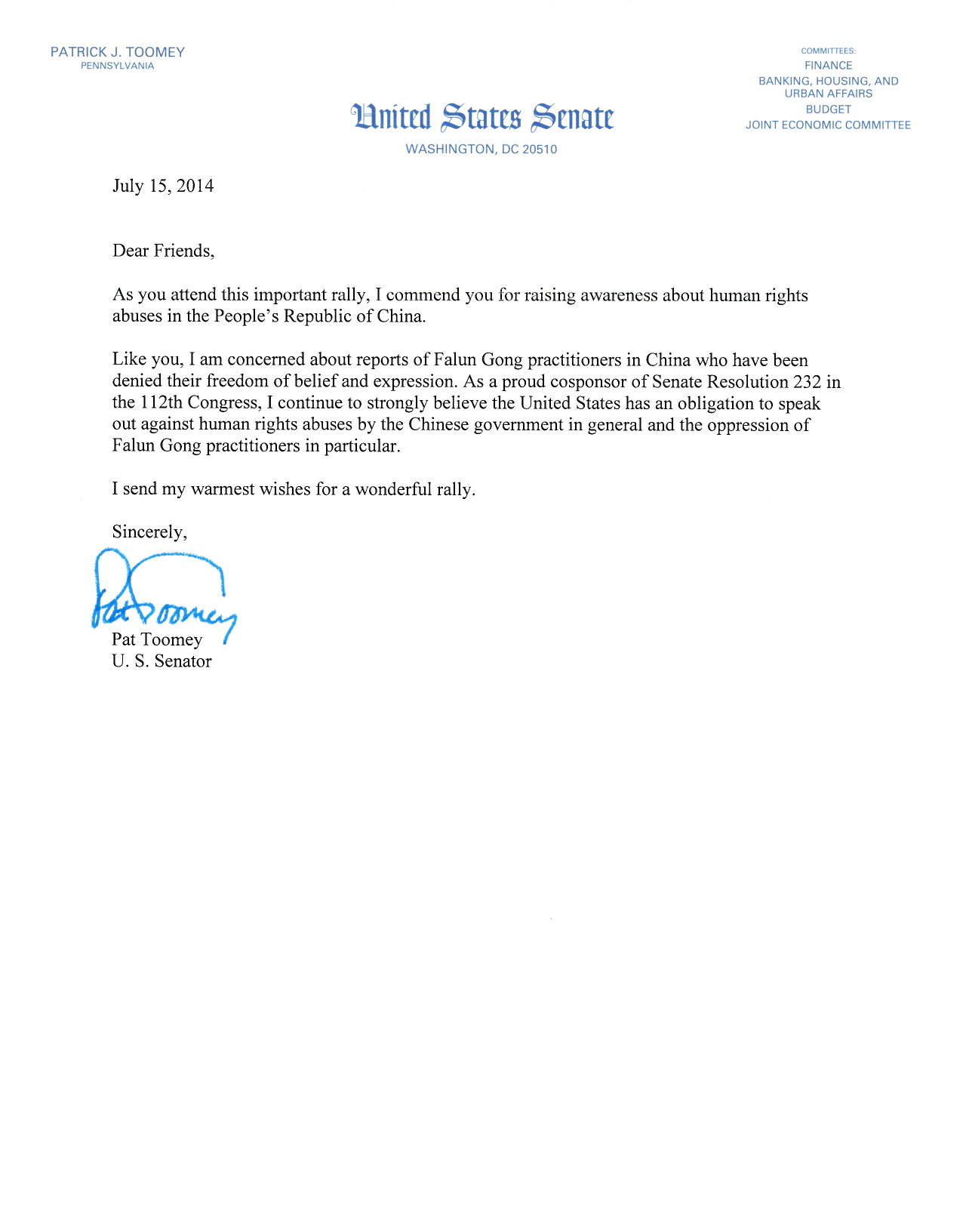 ![]() 宾夕法尼亚州美国国会参议员派特•图米(Pat Toomey) | ![]() 宾夕法尼亚州美国国会参议员派特•图米(Pat Toomey)的信函 |
