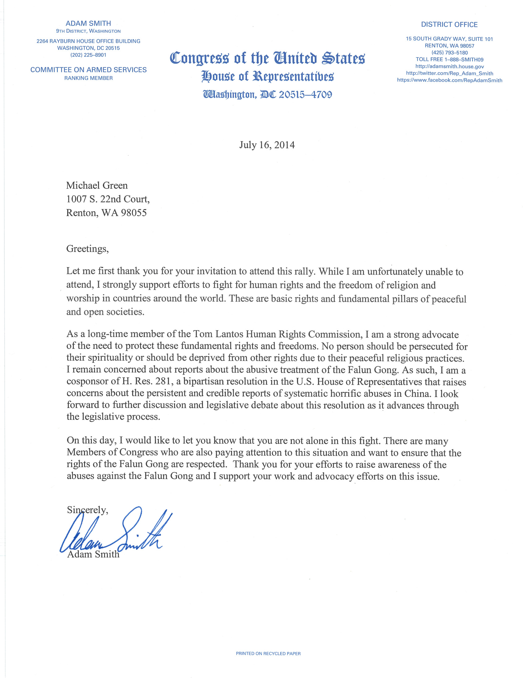 ![]() 华盛顿州联邦众议员及众议院军事委员成员亚当•斯密(Adam Smith ) | ![]() 华盛顿州联邦众议员及众议院军事委员成员亚当•斯密(Adam Smith )的信函。 |