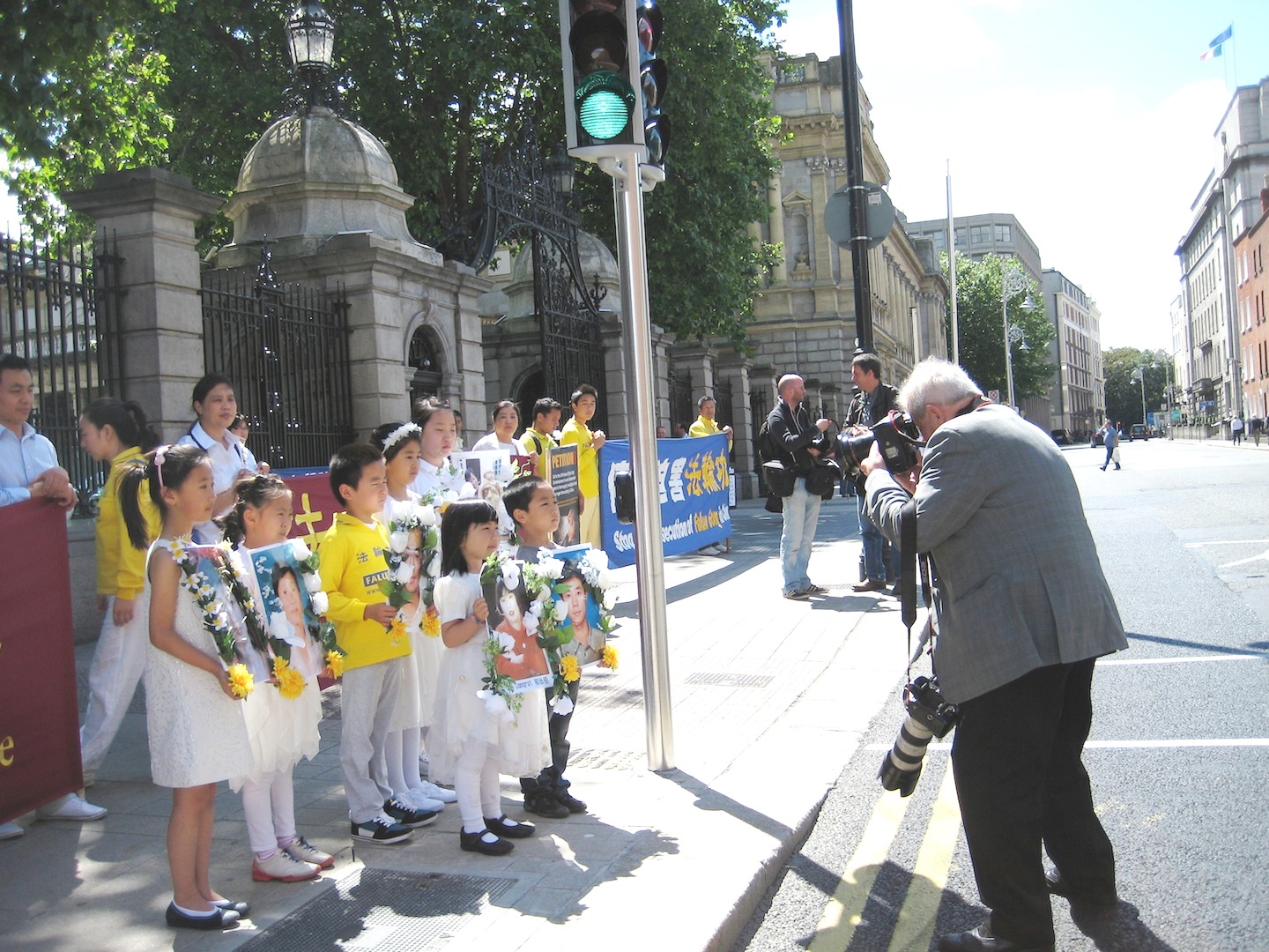 游行队伍行至议会大楼时作了短暂停留。法轮功学员排成两行队伍,静静地举着横幅、捧着遗像,这一幕和中共十五年来对法轮功的凶残迫害相比,此时无声胜有声,爱尔兰的两大主流媒体报纸——《爱尔兰时报》和《爱尔兰独立报》的摄影记者到场拍下了大量照片。