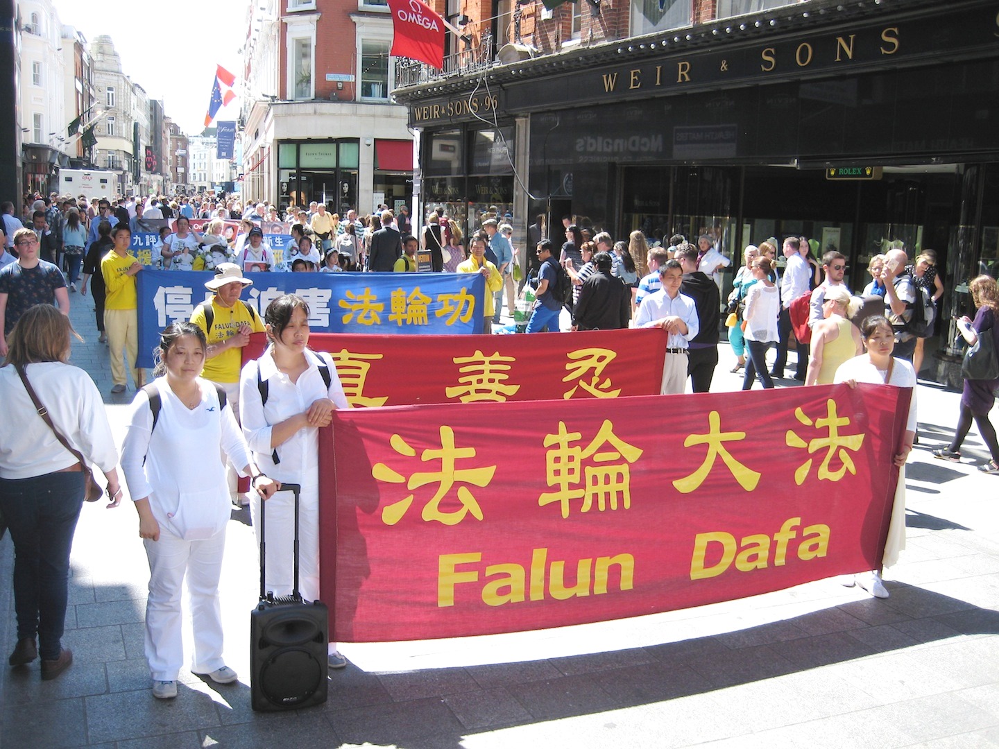 游行队伍最后在都柏林最繁华的步行街——格拉夫顿大街(Grafton Street)举行集会,一边是法轮功学员祥和地演示五套功法;另一边是法轮功学员在烈日下模拟中共酷刑,这鲜明的对比使行人们感到震惊。七月是爱尔兰的旅游旺季,格拉夫顿大街上簇集着来自世界各地的游客。很多人停下脚步聆听法轮功学员的发言,索取真相小册子,并在呼吁停止迫害的签名表上留下他们的支持。