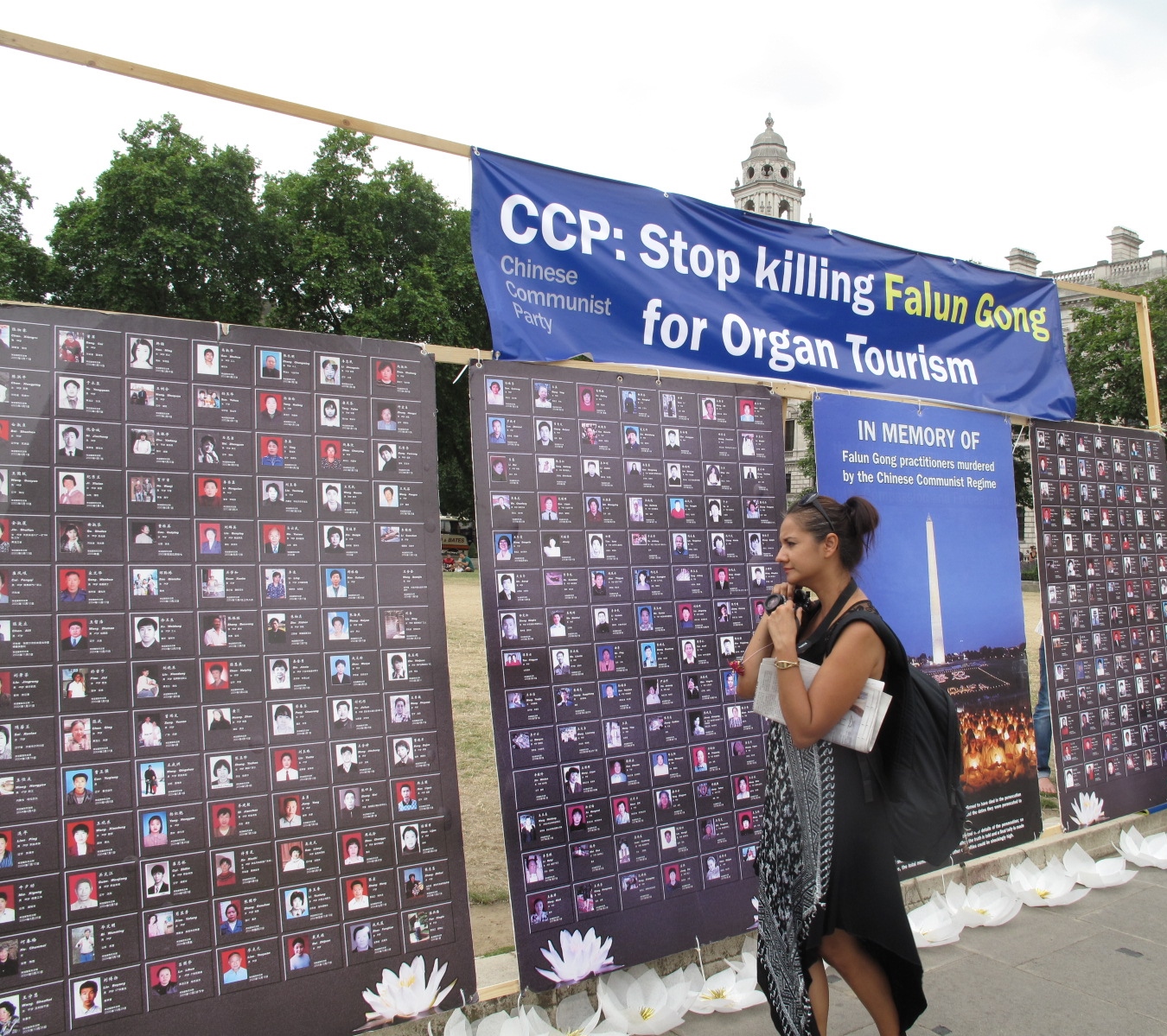来自以色列的母子俩在布满被中共迫害致死的法轮功学员遗像的展板前与法轮功学员长时间交谈。妈妈达芙妮(Dafna)是位教师,第一次来伦敦旅游的儿子高中刚毕业,但非常关注人权,被妈妈称作人权斗士,儿子兹威(Ziv)对法轮功学员说:“我非常感谢你们所做的这些(传播真相反迫害),因为这太重要了,这样的事情发生在人类身上太糟糕了,所以你们这样做(制止迫害和活摘器官罪恶)太好了。”