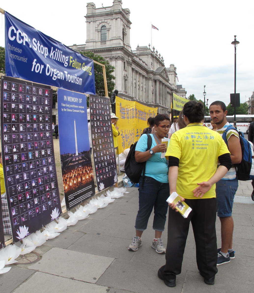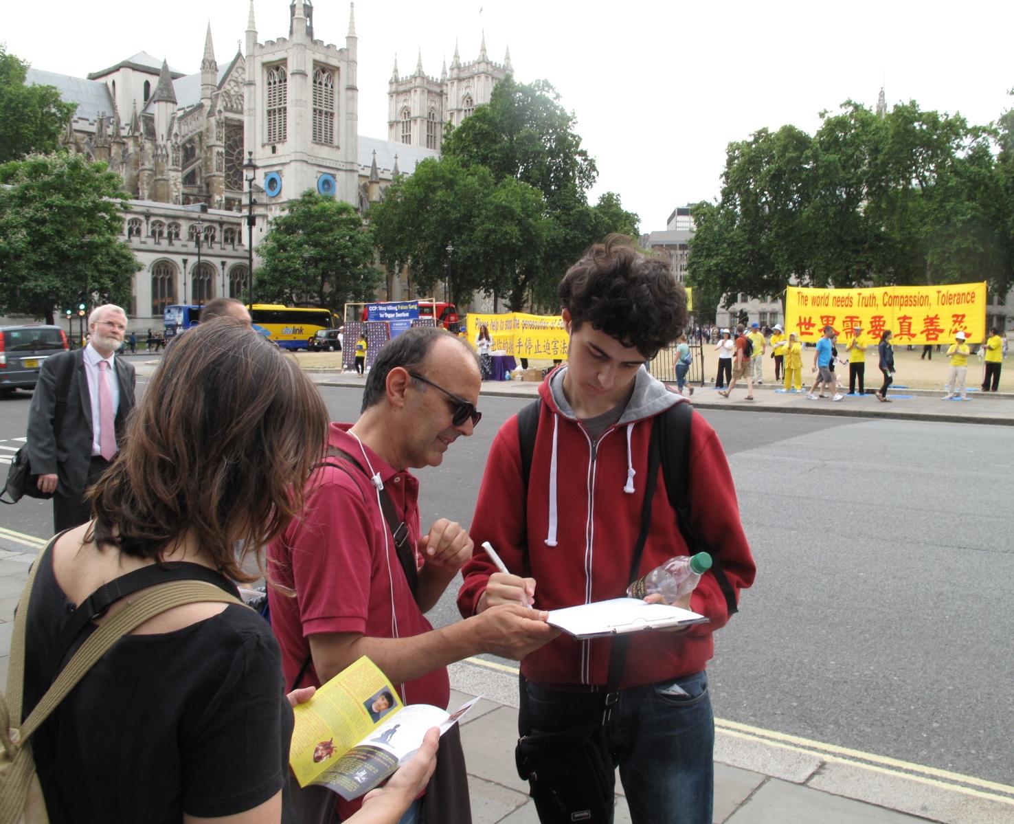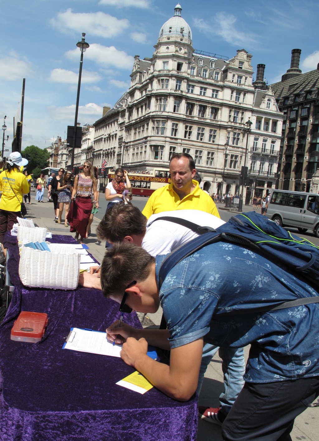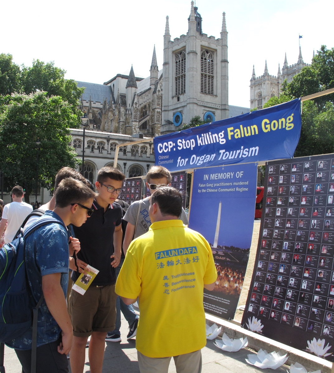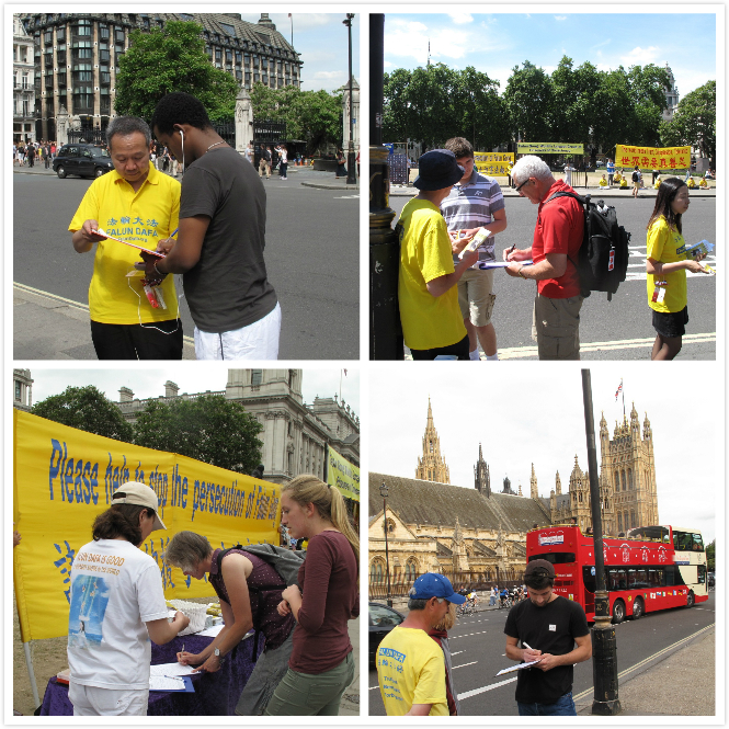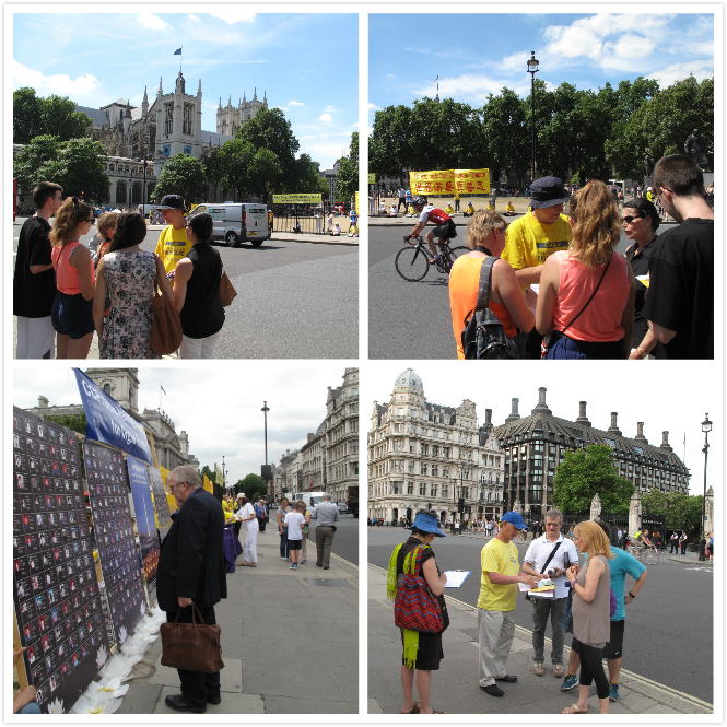 这是伦敦入夏以来最热的一天,骄阳似火,烈日下,平静入定炼功的法轮功学员传递出宁静祥和的能量;同时,法轮功学员以多种方式揭示出的中共迫害法轮功真相引发人们思考。法轮功学员传递出的真相信息清晰明了,让站在远处观望的人也能一目了然。当天经过国会大厦前广场的人,包括那些步行的、骑车、开车的、坐公交车的,成百上千的人看到了这道独特的风景。另外,多位法轮功学员在人群中不断地向过往行人和游客发放法轮功真相传单,并拿着反活摘征签板在国会大厦周围的不同地点征签。
