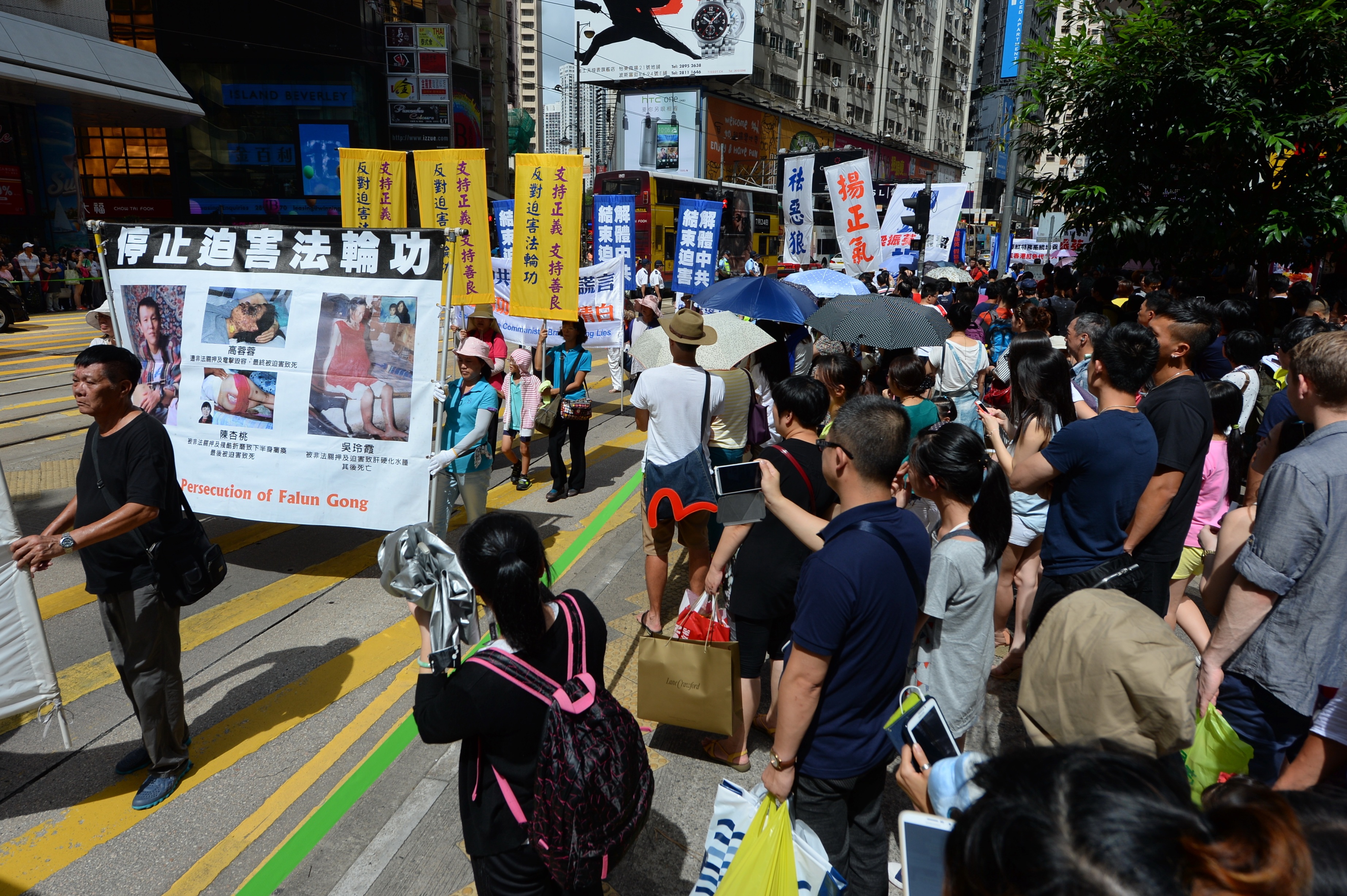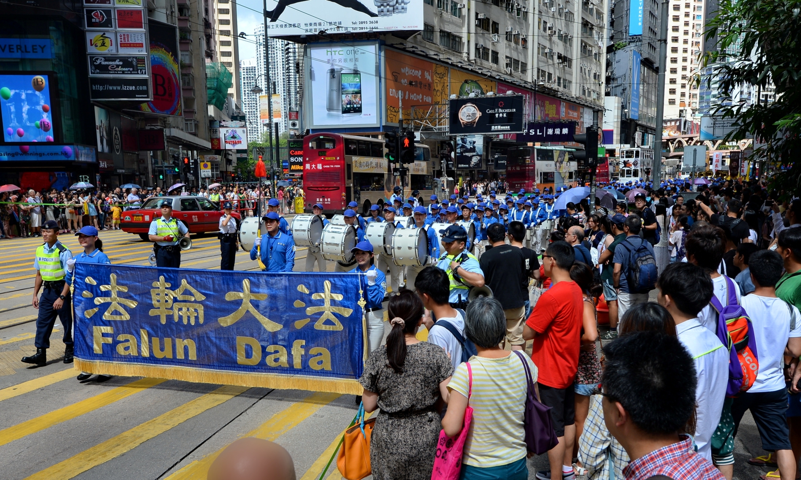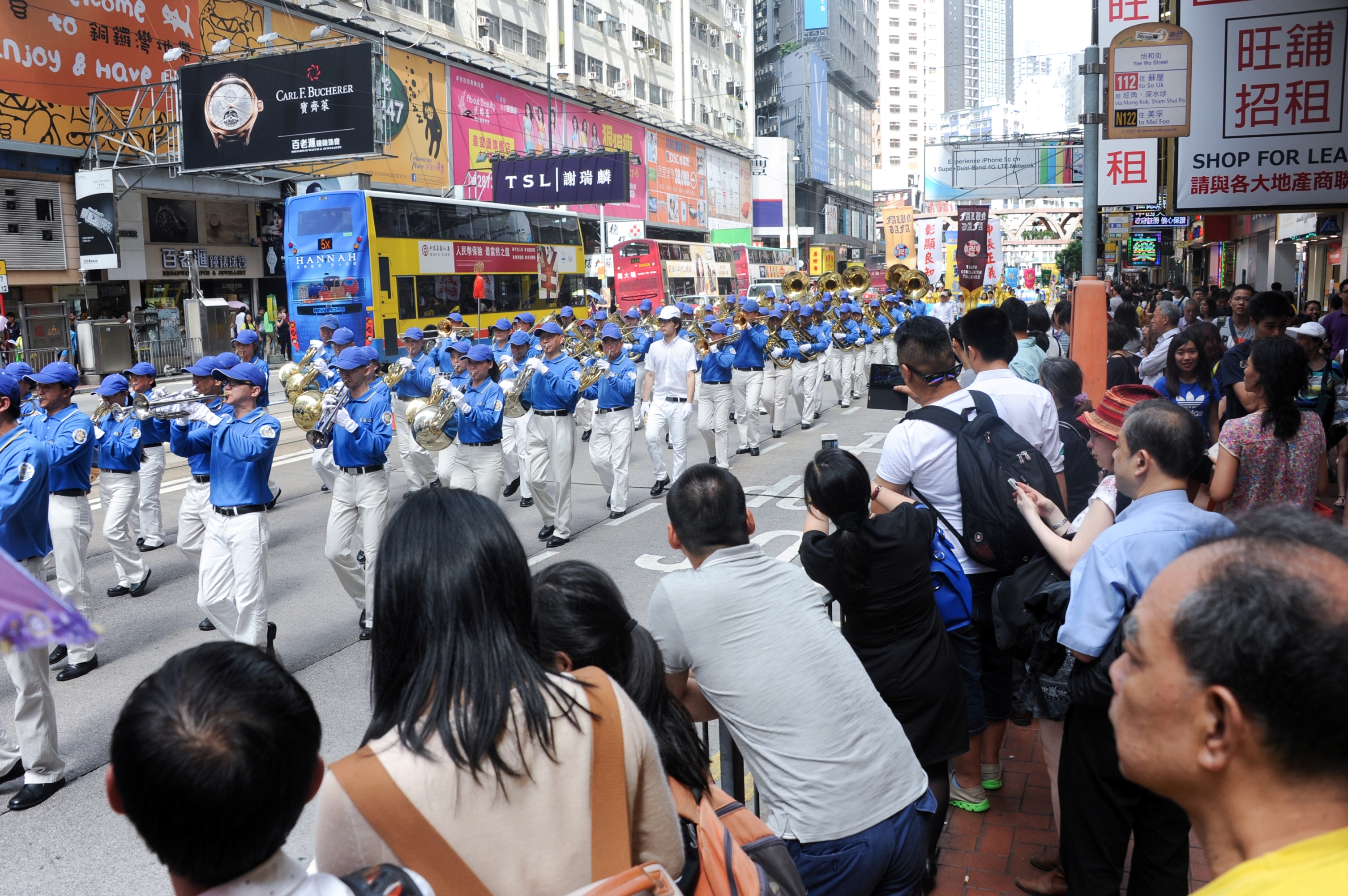 下午一点半,近千名法轮功学员组成的游行队伍,分为“解体中共结束迫害”、“和平理性反迫害”、“扬正气驱妖狼”、“·九·评*神威天灭中共”、“彰显良知解体恶党”以及“法轮大法好”等六个方阵,由天国乐团领头,从港岛区的北角英皇道游乐场出发,沿着港岛区英皇道、轩尼诗道,途经闹市铜锣湾、湾仔,前往金钟政府总部,行人、游客纷纷驻足观看或拍摄游行队伍及标语。