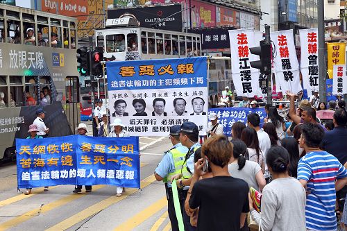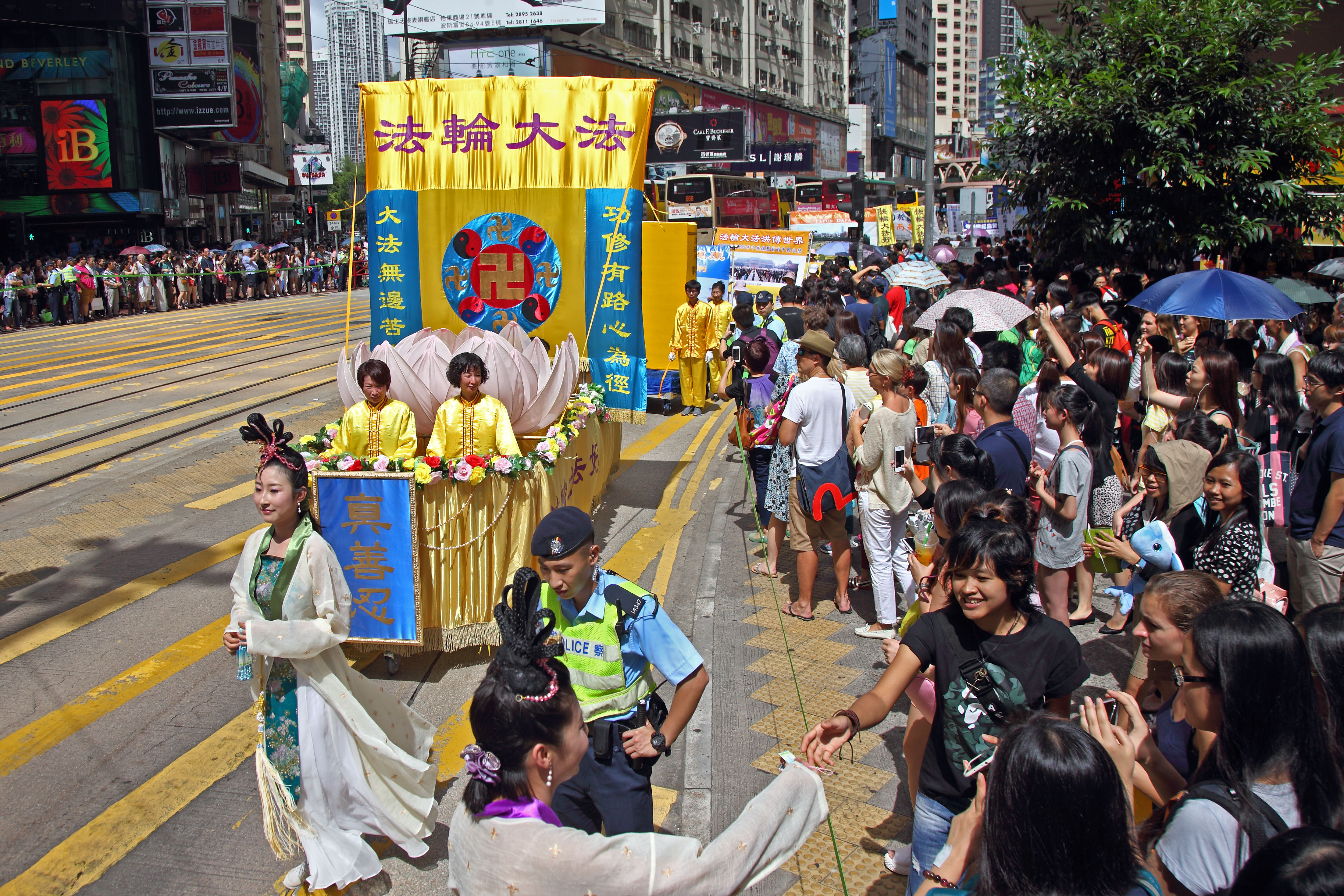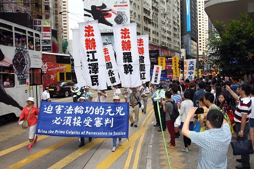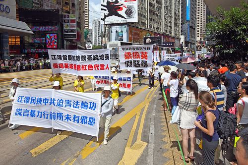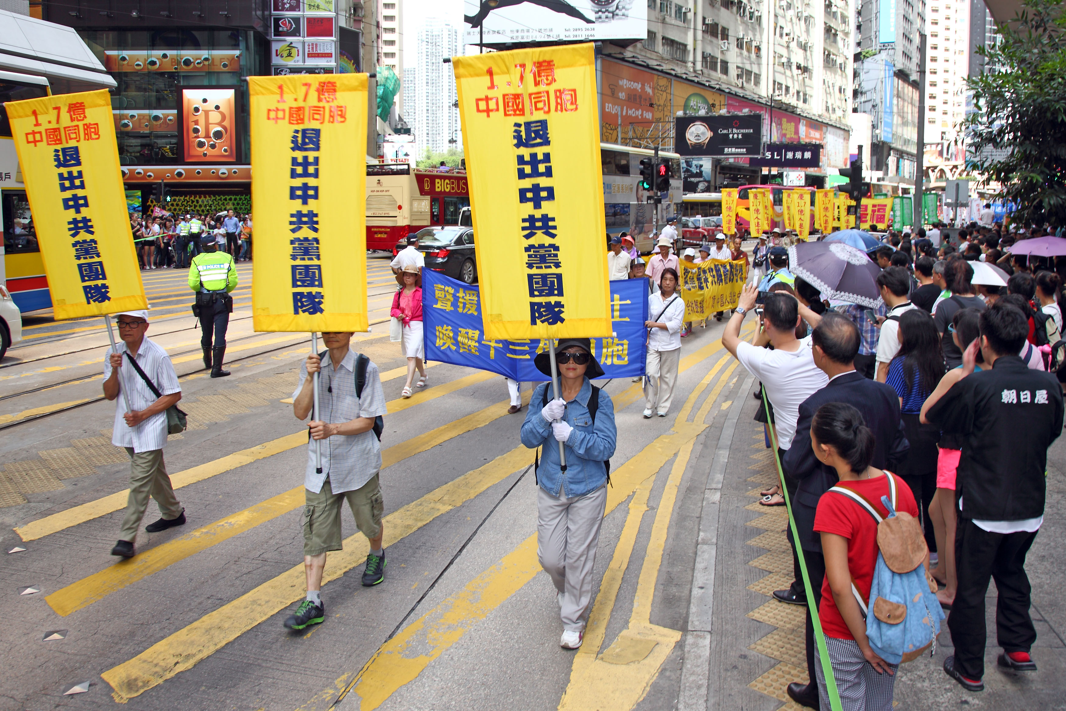 下午一点半,近千名法轮功学员组成的游行队伍,分为“解体中共结束迫害”、“和平理性反迫害”、“扬正气驱妖狼”、“·九·评*神威天灭中共”、“彰显良知解体恶党”以及“法轮大法好”等六个方阵,由天国乐团领头,从港岛区的北角英皇道游乐场出发,沿着港岛区英皇道、轩尼诗道,途经闹市铜锣湾、湾仔,前往金钟政府总部,行人、游客纷纷驻足观看或拍摄游行队伍及标语。