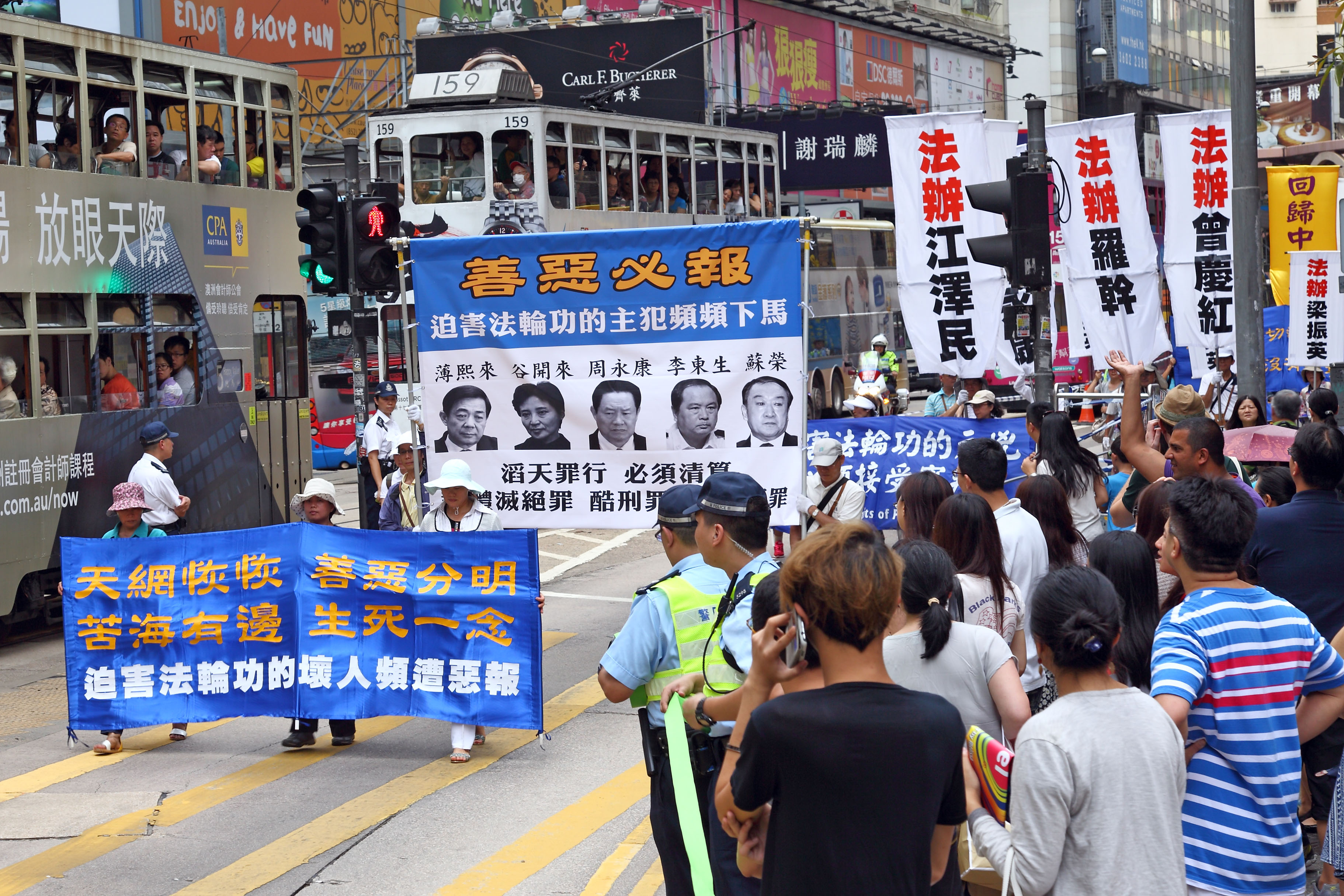英皇道上,五、六位操着大陆口音的年轻人手指“善恶必报,薄熙来、谷开来、周永康、李东生、苏荣,滔天罪行,必须清算群体灭绝罪、酷刑罪”的横幅,一边念着横幅上的每一字,其中有人回应说:“活该这样(报应)!”