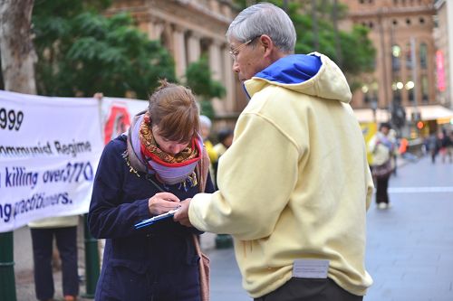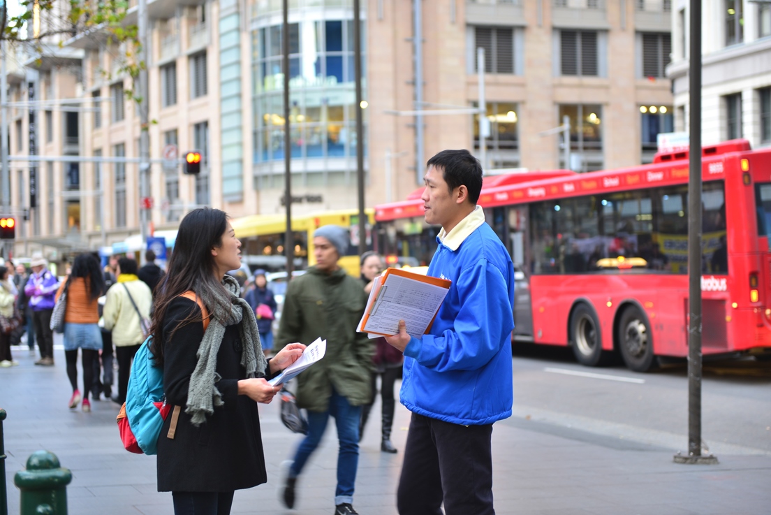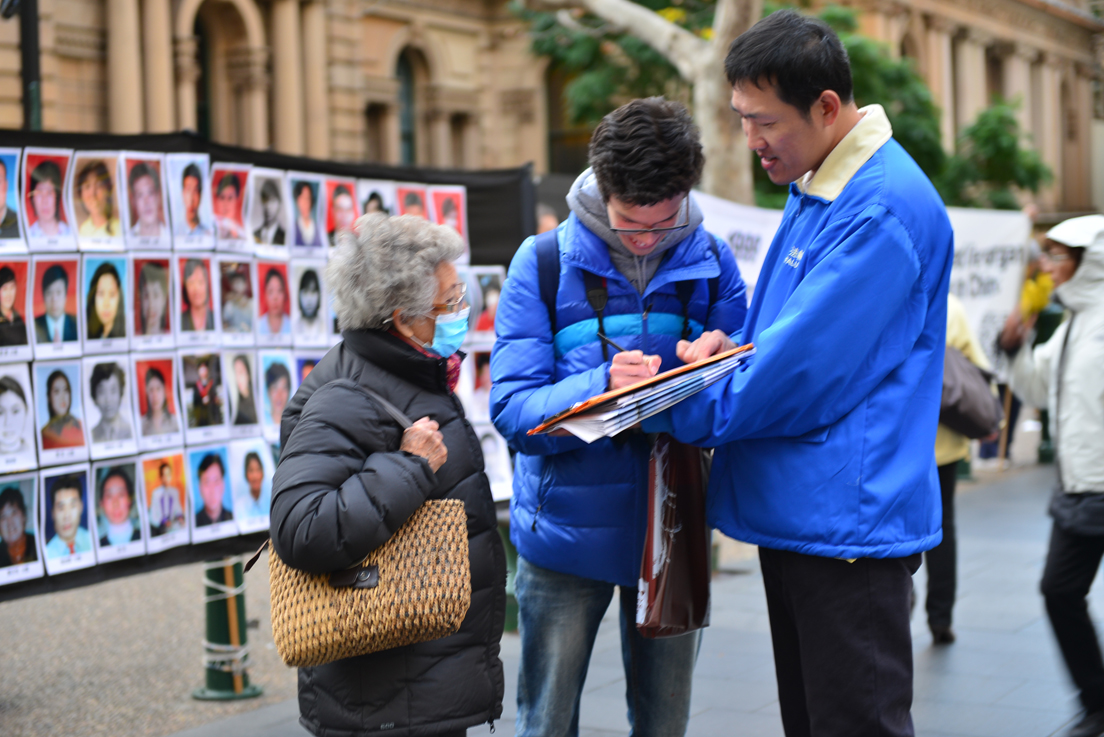 继七月十六日,澳洲各地的法轮功学员在澳大利亚首都堪培拉国会山庄前举行集会,以及七月十八日在悉尼最繁华商务中心马丁广场举行真人反酷刑展,和当天举行的盛大游行一系列活动,越来越多的澳洲居民明白真相,许多上班族下班路上驻足观看,聆听真相,有的一群人或一家人一起在“帮助制止活体摘取法轮功学员器官”的征签表签名支持。还有许多大陆来悉尼读书的留学生也纷纷停下脚步了解真相,做了“三:退.”。