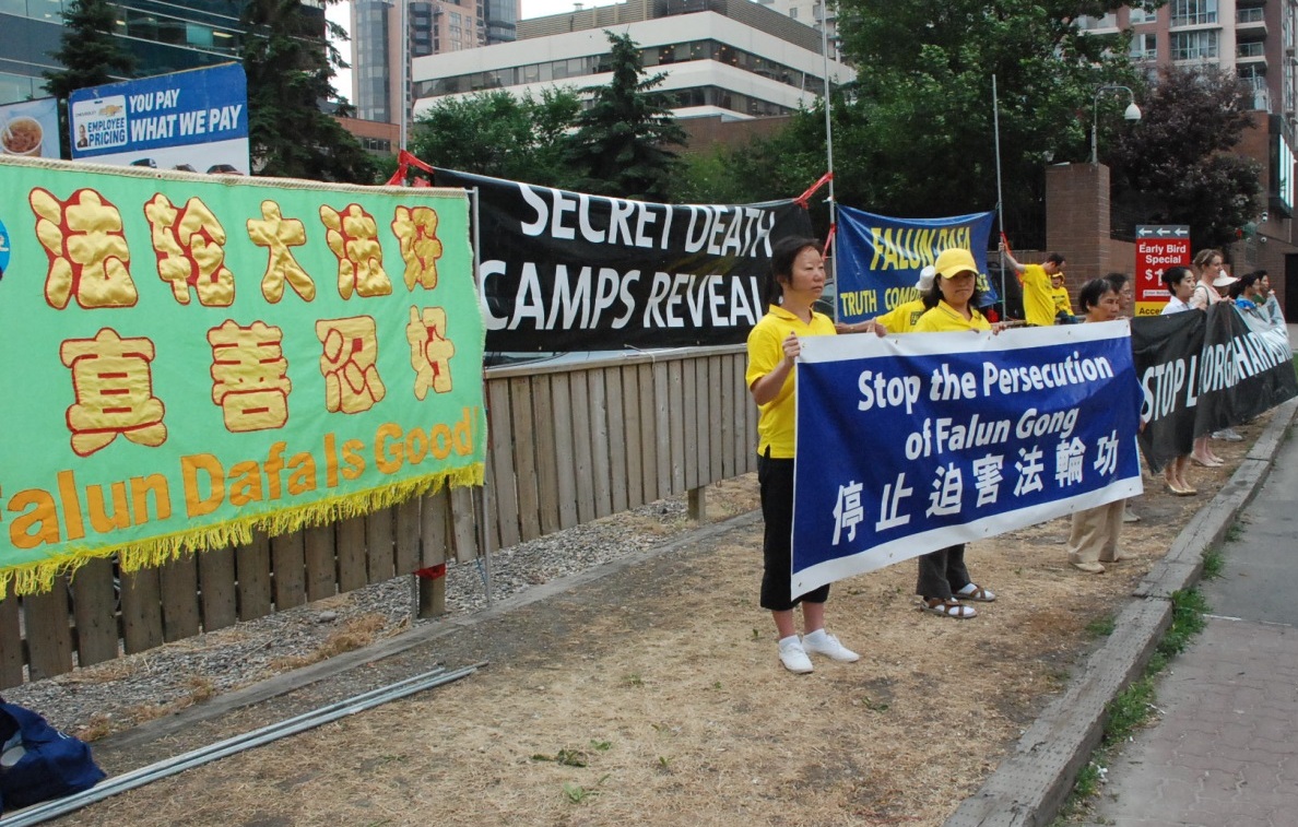 集会之后,部份法轮功学员在卡尔加里中领馆前拉起横幅,进行抗议。尽管其间遭遇台风和暴雨,法轮功学员平静地在风雨中静静伫立,展现了大法修炼者祥和的风范,感动了无数过往的路人和下班的工作人员。