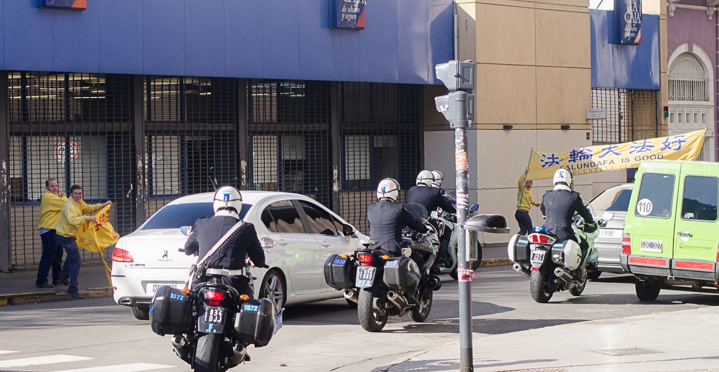阿根廷警察在现场命令中共华人打手不得靠近。习*近*平的车队路过,近距离地慢下来,看到了阿根廷学员和平请愿队伍,和“法轮大法好”、“停止迫害法轮功”等现场横幅。