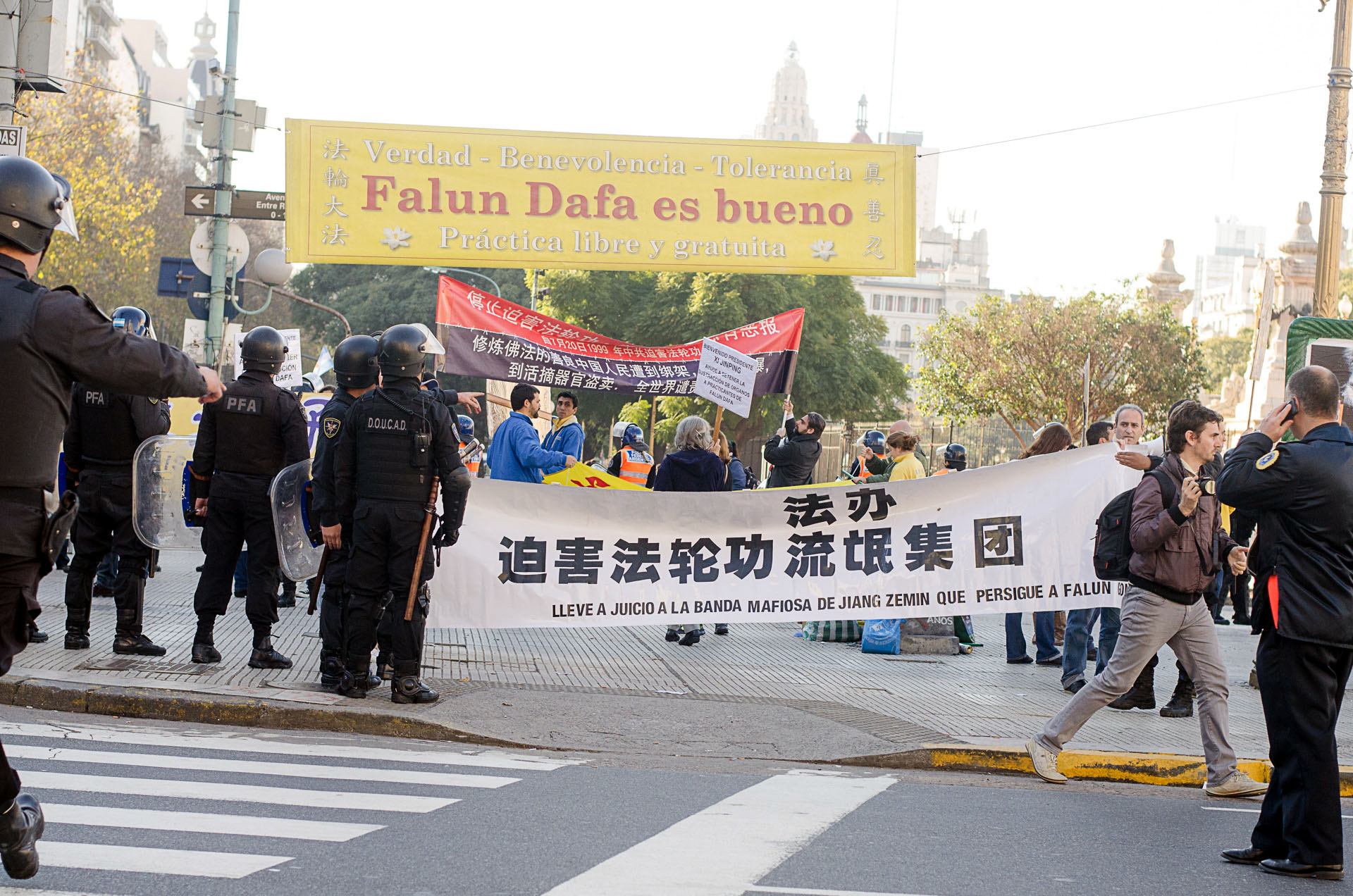 傅女士说,中共阿根廷大使馆的一位副武官来到现场,此后,一群中共打手强行撕破数个横幅。阿根廷警方在目睹其暴行后,非常惊讶,随后警方派来大批武装警察保护法轮功学员自由言论权,在华人打手和学员之间排好队伍,要求中共打手不得靠近。