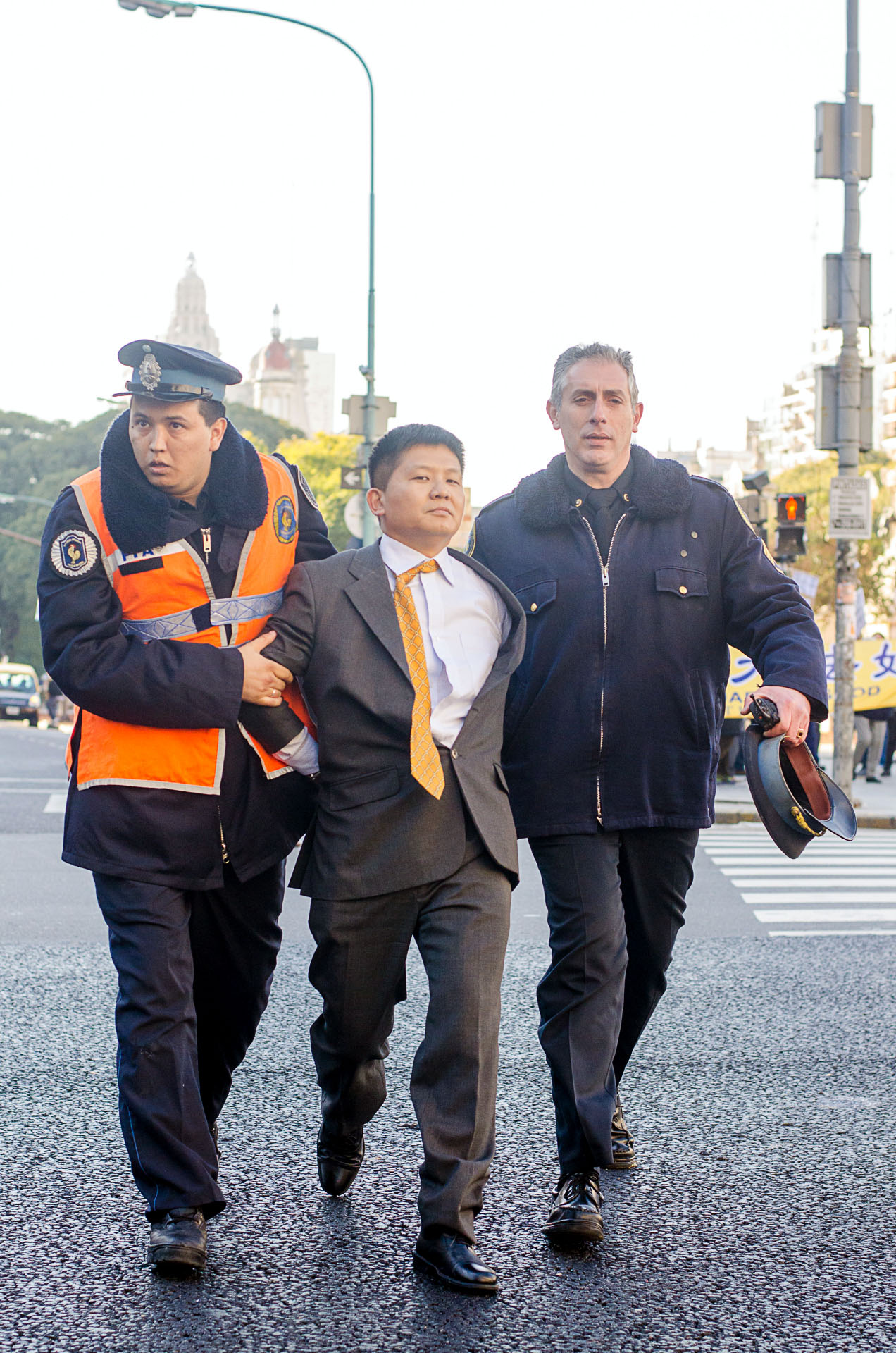 但是,中共大使馆的副武官组织其他打手特务手持红旗,强行要突破警方的防线,直奔法轮功学员。最后阿根廷警察将要强行冲过防线的中共大使馆副武官逮捕。警方向法轮功学员透露,虽然此人是中共的外交官,但也要将其拘捕。