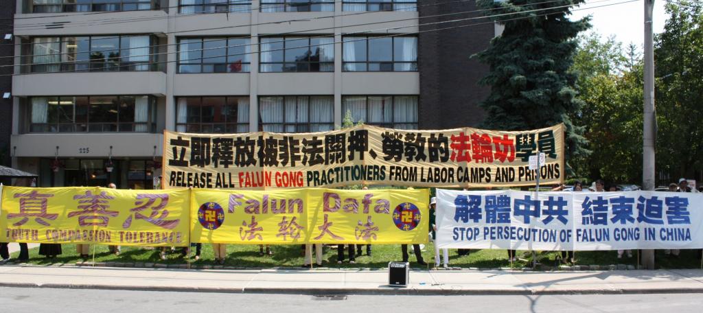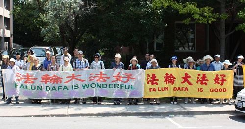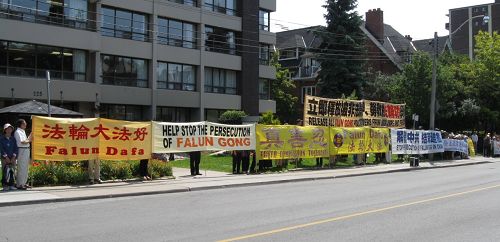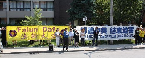 十八日上午,来自大多伦多地区的法轮功学员来到中领馆门前的街道,平静而井然有序的站在人行道的一侧;手举横幅,上面写着:“法轮大法好”、“真善忍好”、“解体中共,结束迫害”、“立即释放被关押的法轮功学员”等标语。正值上班时间,到领馆办事的路人都纷纷停下来观看和聆听集会发言,有路人当场签名制止迫害,有不少华人接过真相资料并道谢。
