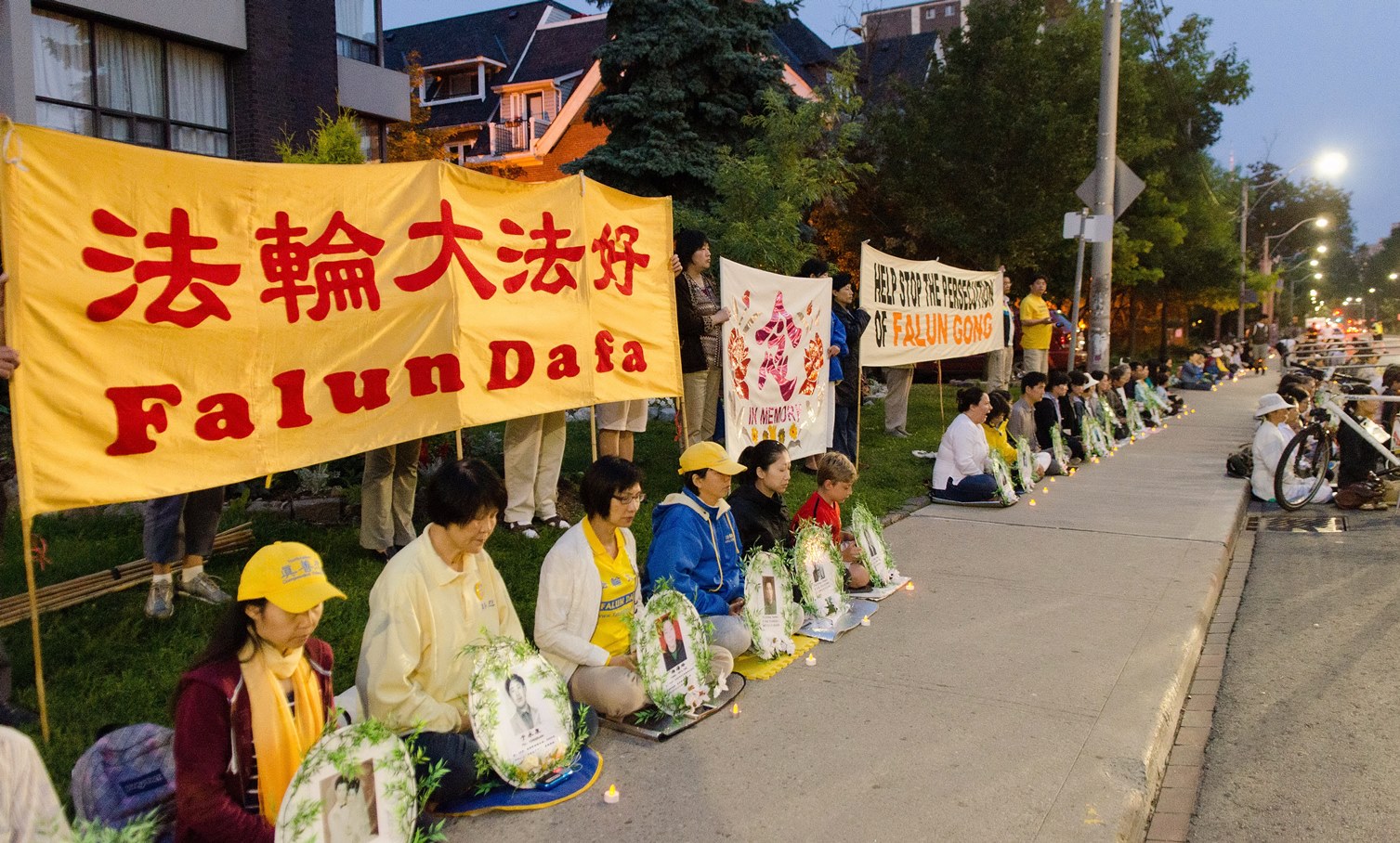 继七月十四日到十七日(星期一至四)在各繁华路口给上班族的民众面对面讲真相后,十八日星期五上午,法轮功学员在St.Gorge街的中领馆门前举行集会,纪念反迫害十五周年;二十日的晚上八点至十点,法轮功学员在中领馆前举行了烛光悼念活动,谴责中共暴行,呼唤正义良知,结束迫害。