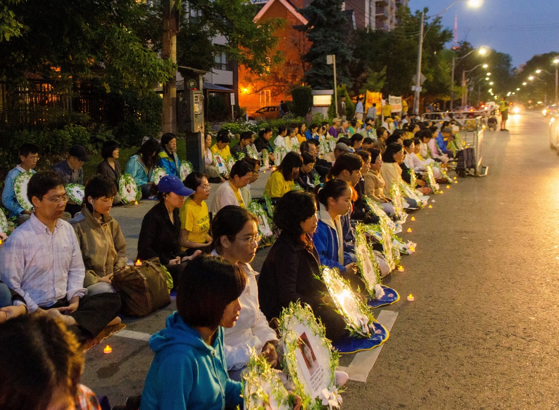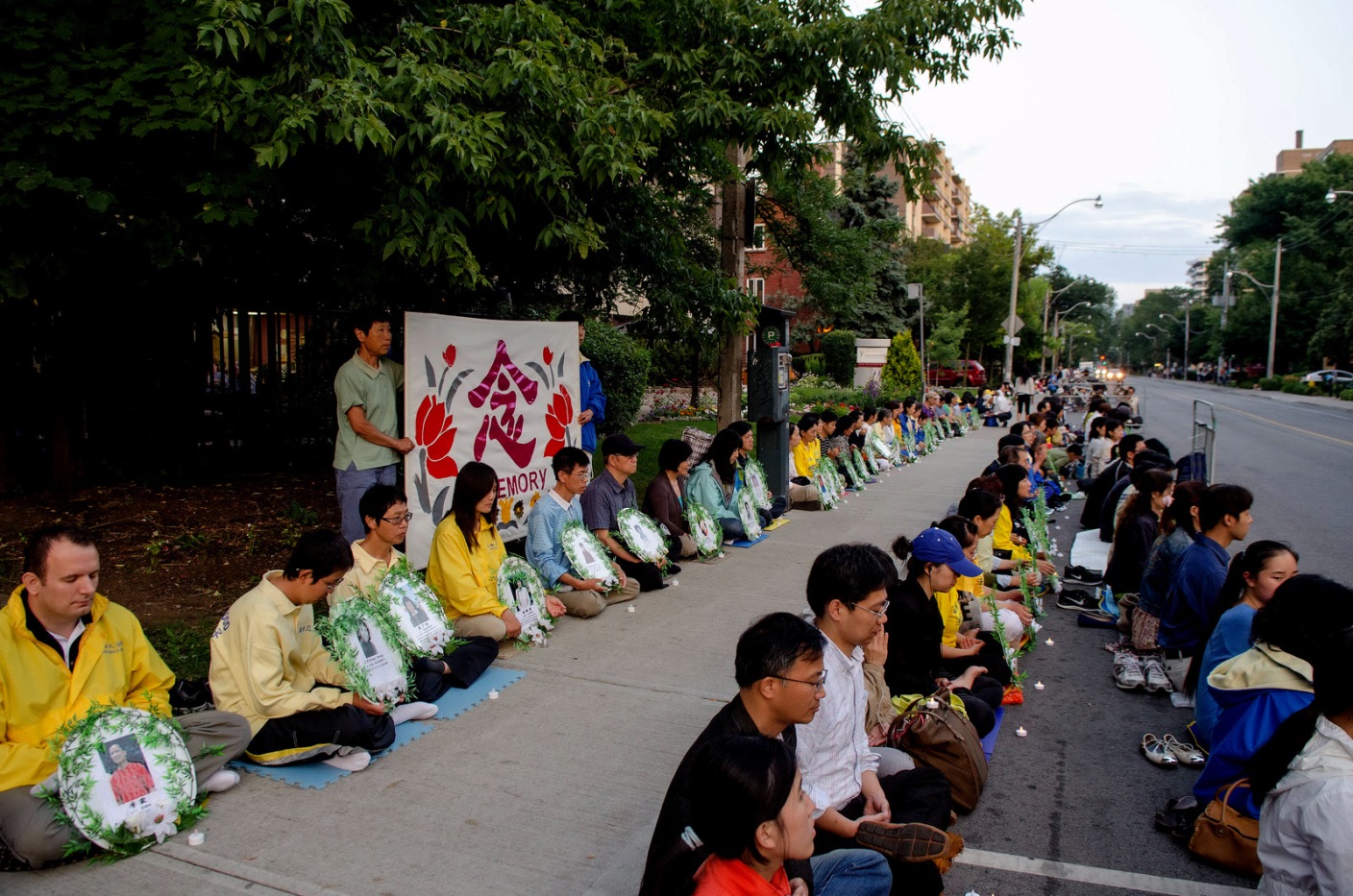 ![]() 图8-13:二十日的晚上八点至十点,法轮功学员在中领馆前举行了烛光悼念活动,谴责中共暴行,呼唤正义良知,结束迫害。 |