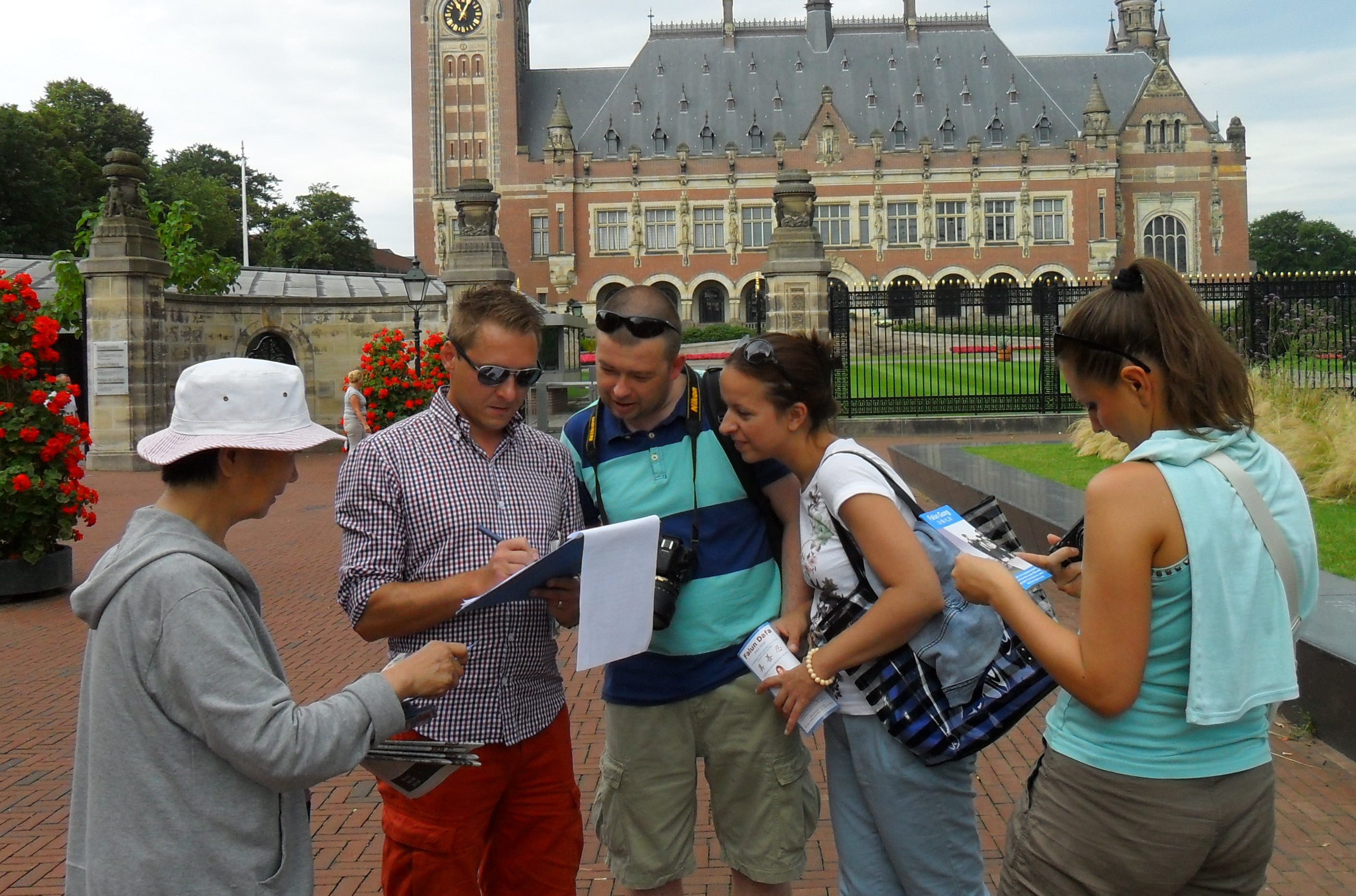 法轮功学员在海牙国际法庭门前广场向游客讲真相
