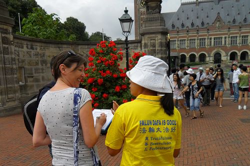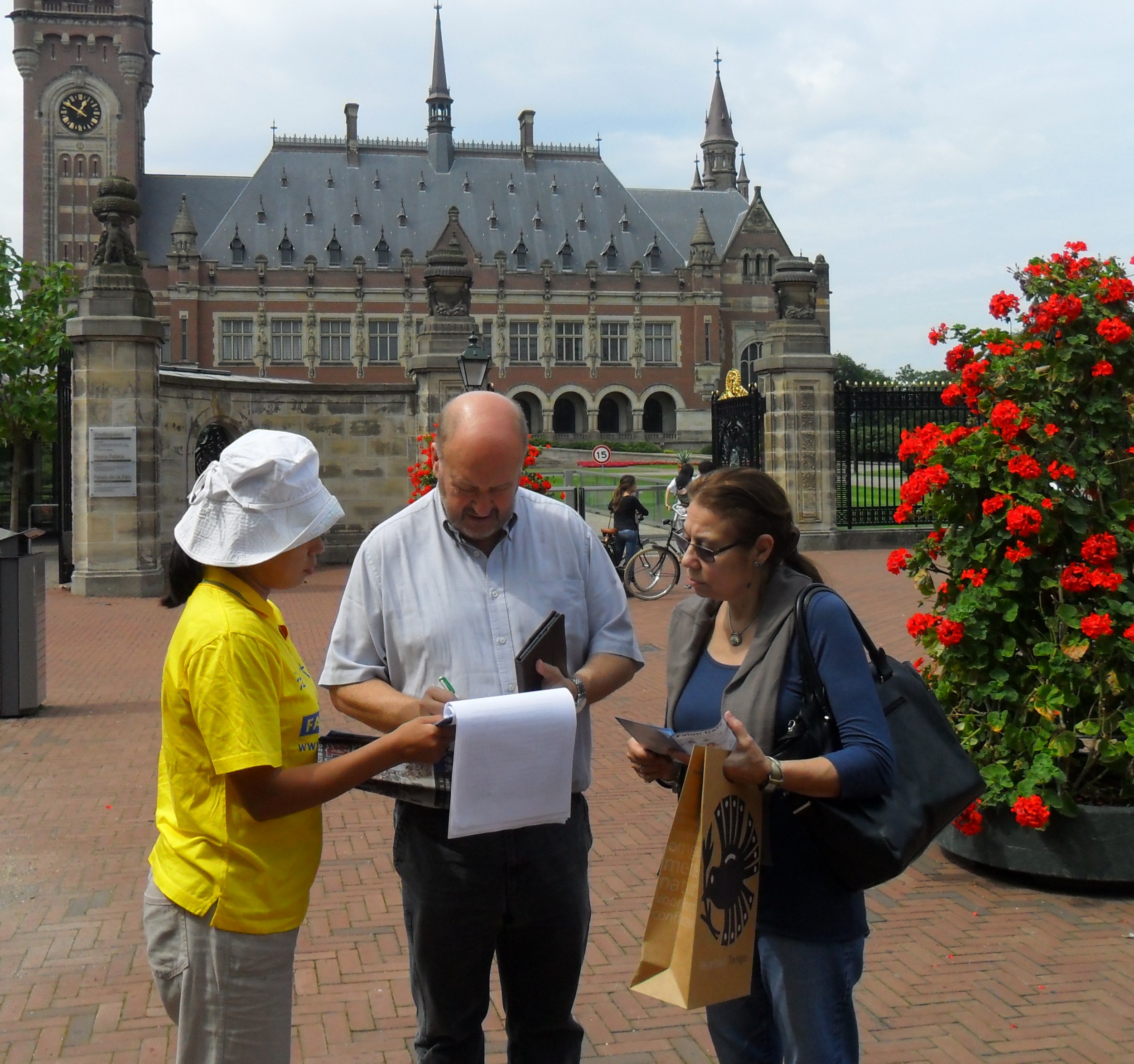 海牙国际法庭门前,各国游客纷纷签名支持法轮功学员的信仰自由,一些中国游客听到中共迫害法轮功的真相,以及中共活摘器官的暴行,也感到震惊,有的当场声明退出中共的相关组织。