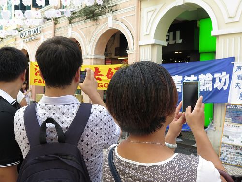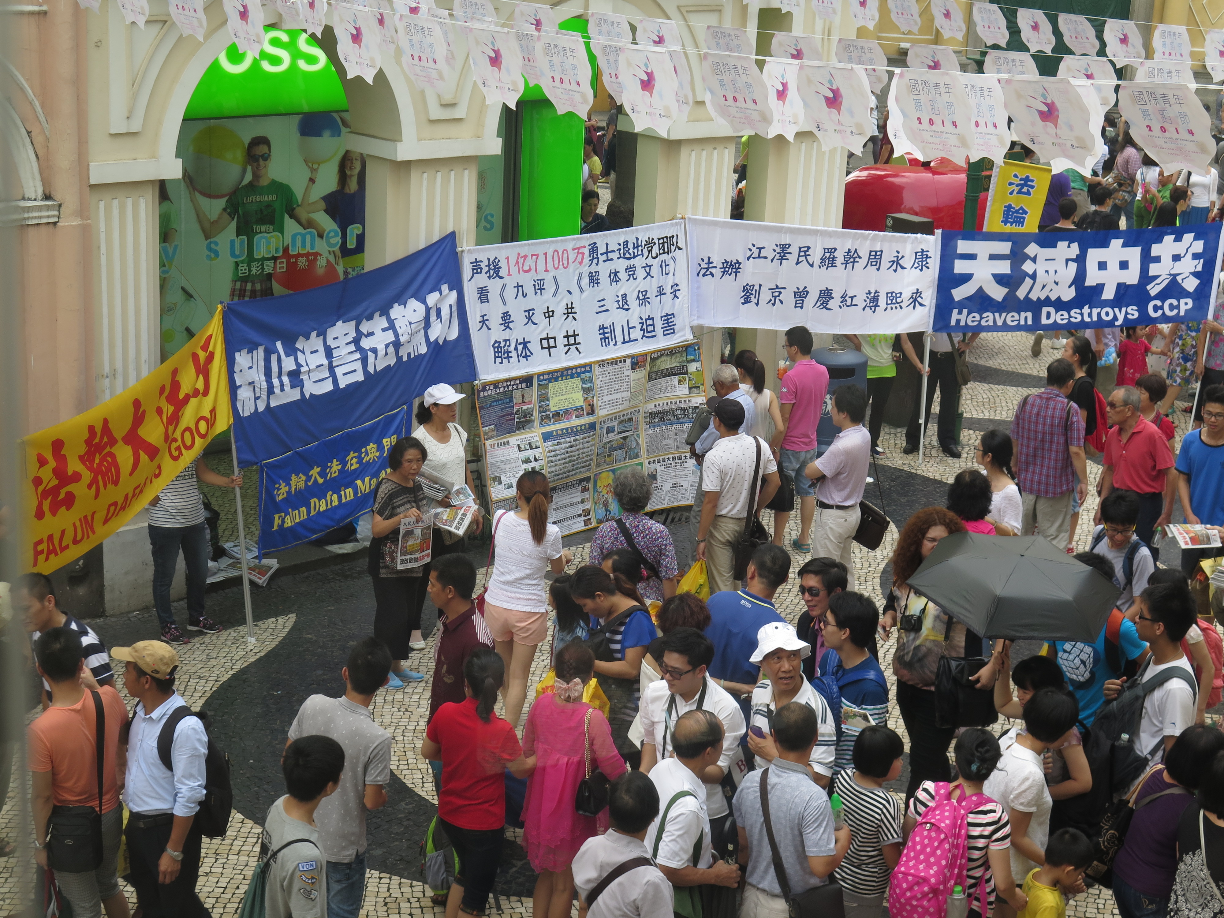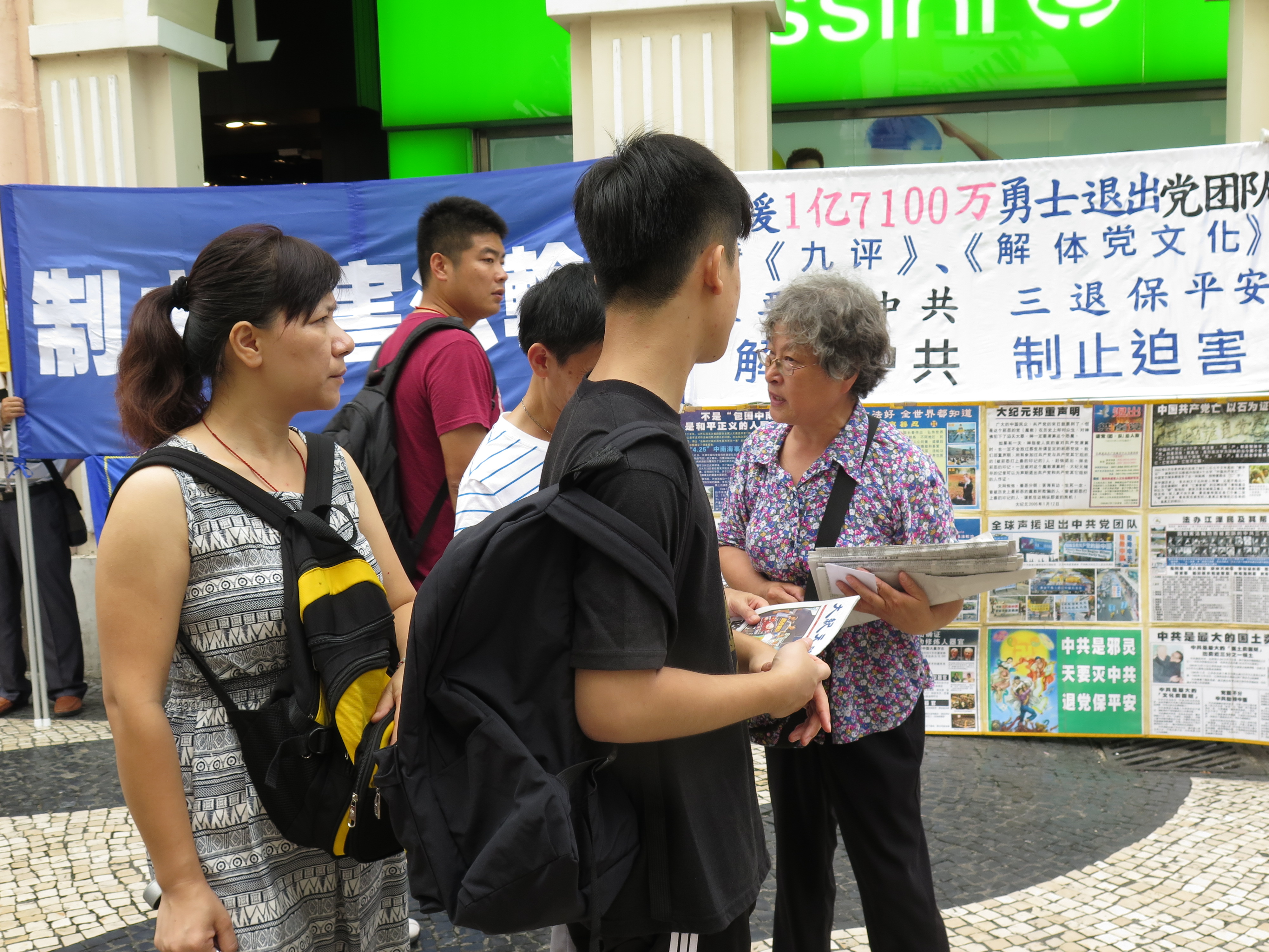 来自广东的年轻人,还不明白法轮功真相,对法轮功学员在澳门的公开活动感到意外,学员告诉他们法轮大法弘传世界,只有中共在迫害,还给他们讲了天安门自焚伪案及“四二五”万人上访的真相,他们明白后,立即声明退出曾参加过的共青团及少先队。