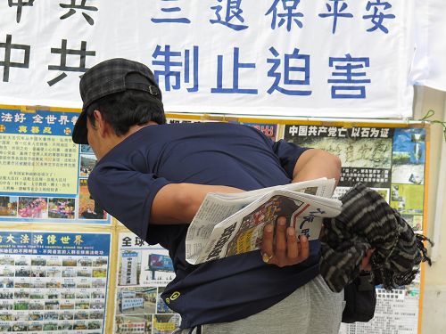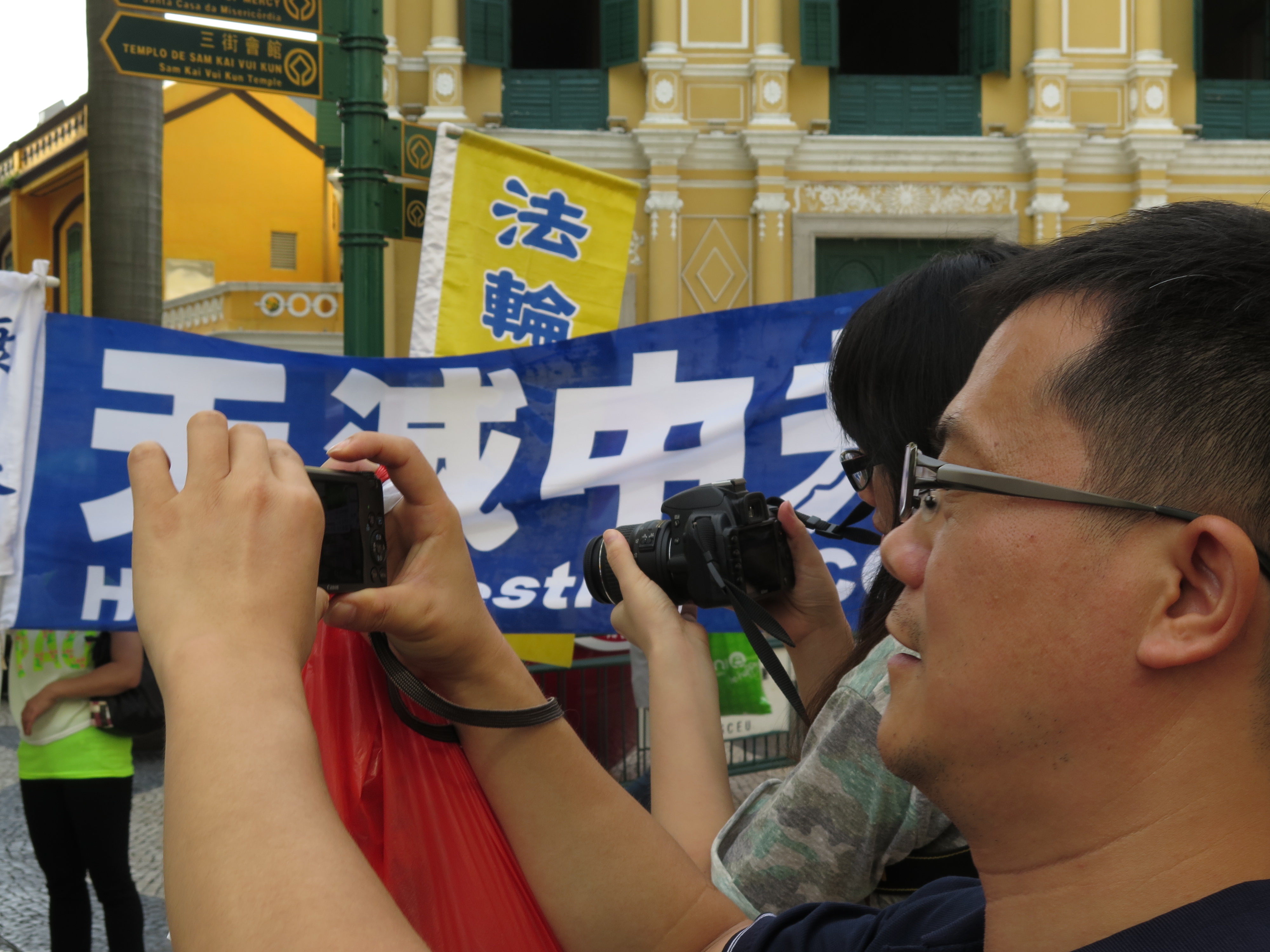 集会活动下午三点开始,当大横幅及真相图片一打开,就吸引大批大陆游客围观,其中更有不少游客蹲下来,细心地观看真相图片,也有很多游客拿出相机、手机,拍下集会的场景,带回大陆。