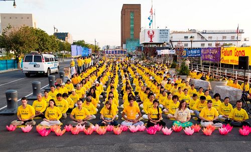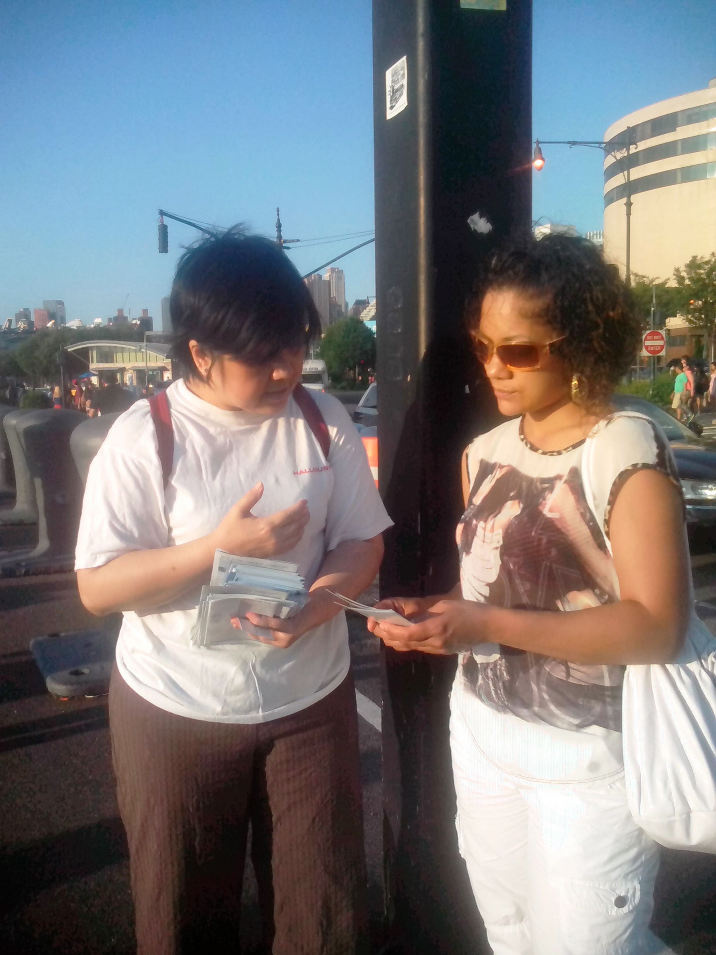 集会现场慈悲庄严,纯正的能量场吸引了不少纽约人观看拍照。学员们一一跟他们讲真相,拿真相资料让他们了解。人们都很震惊于迫害的残酷,纷纷表示谴责。在医疗界上班的安琪儿(Angel)说:“没有人可以这样做,摘取器官贩卖。我会到网站上去了解,然后发到社区媒体上,让更多人知道这个(罪行)。”
