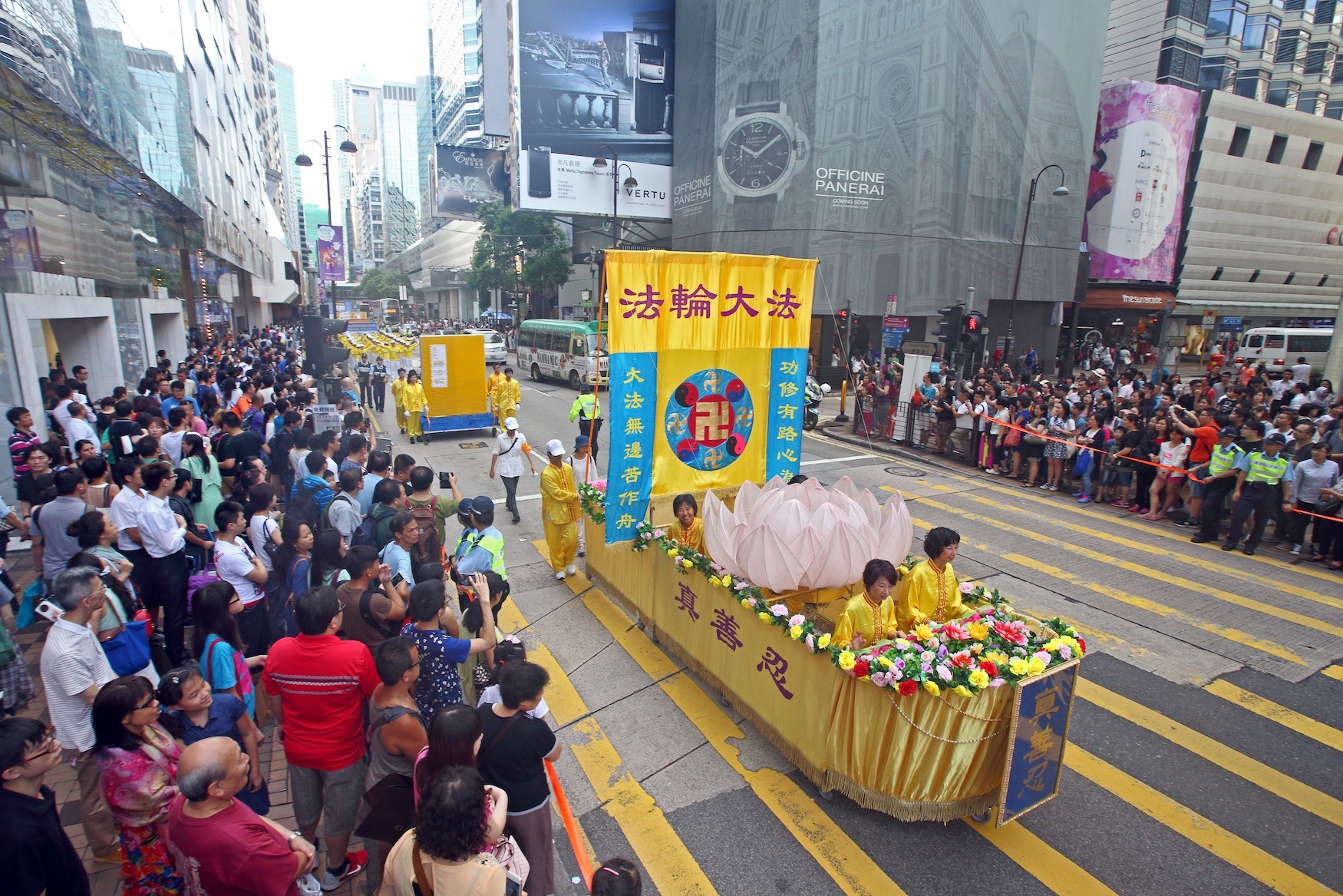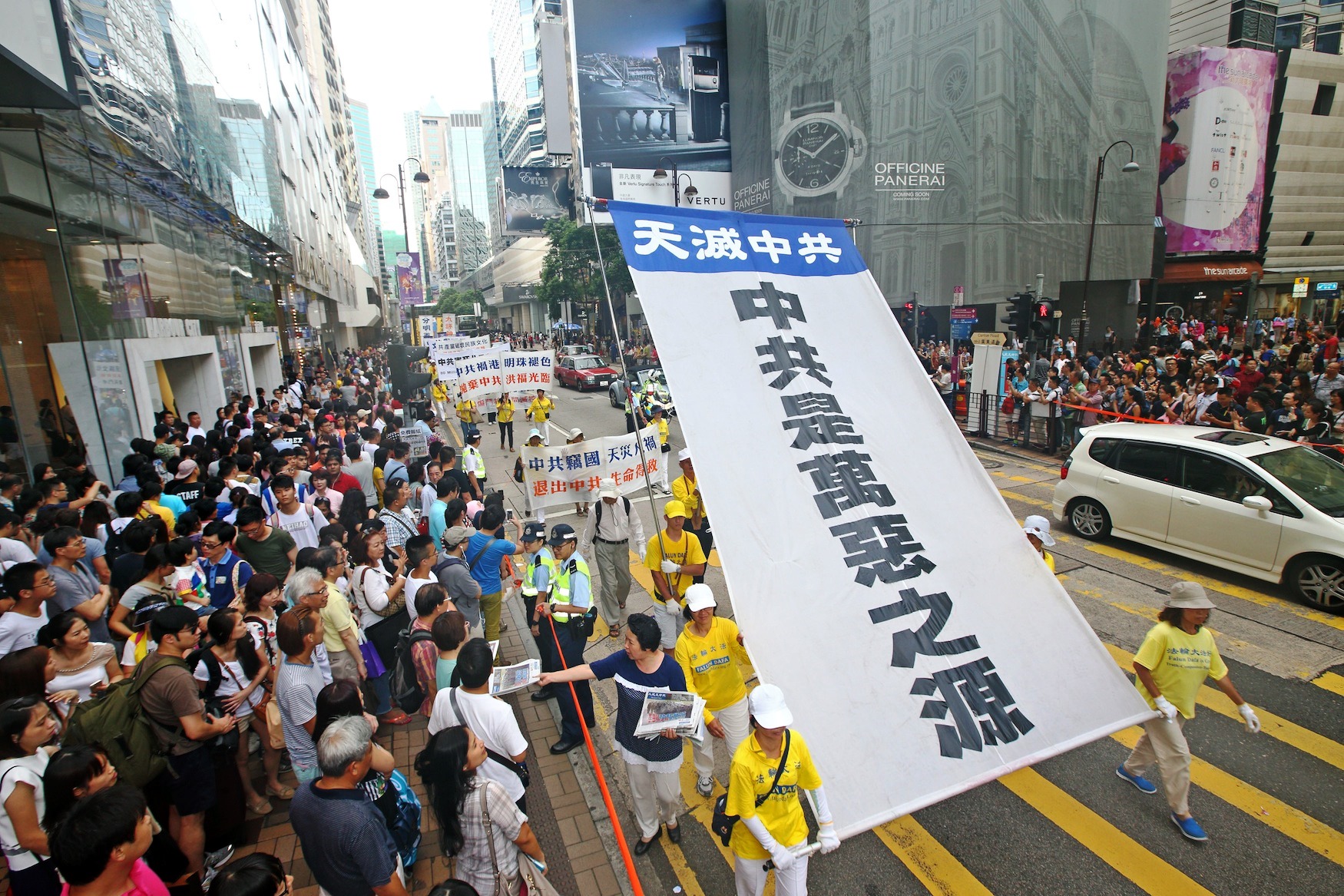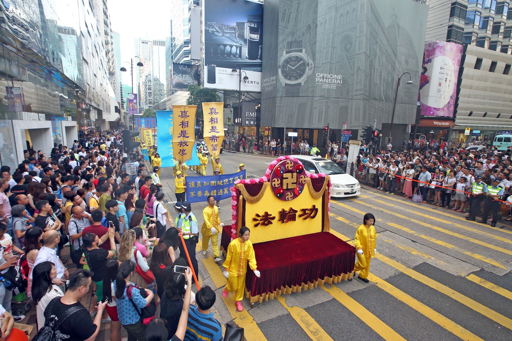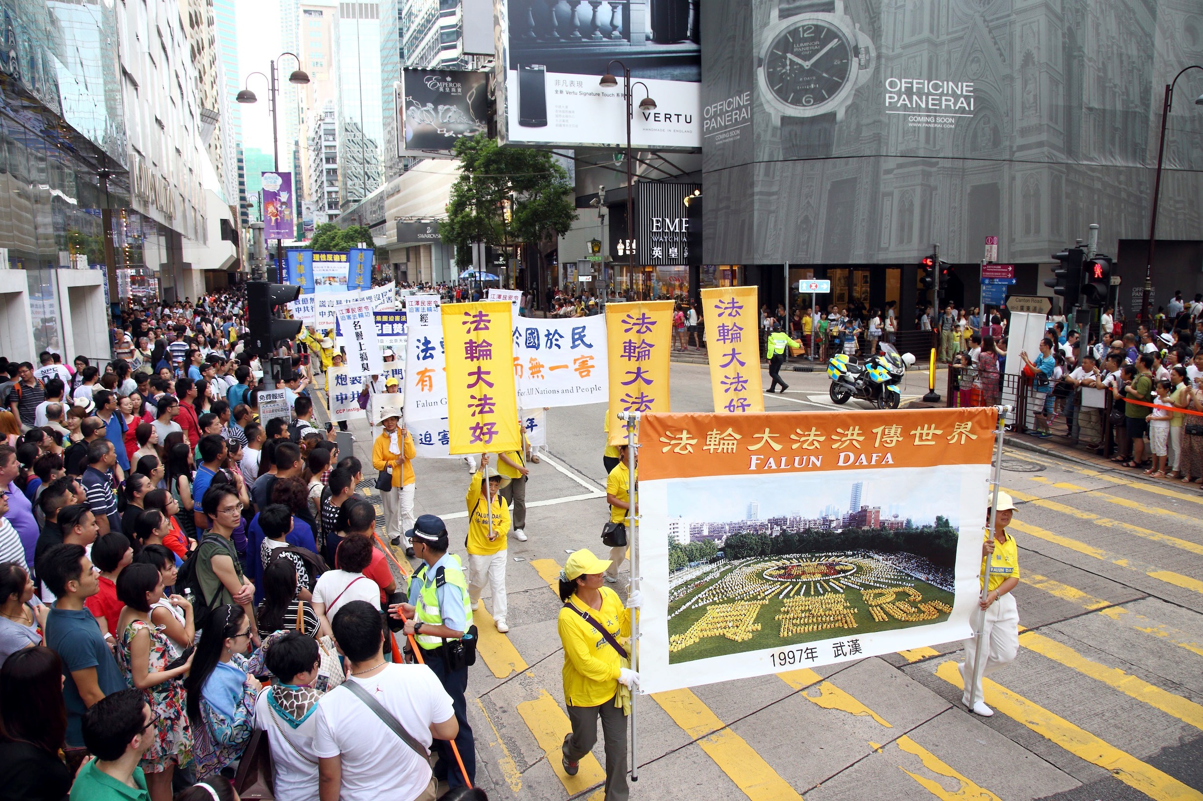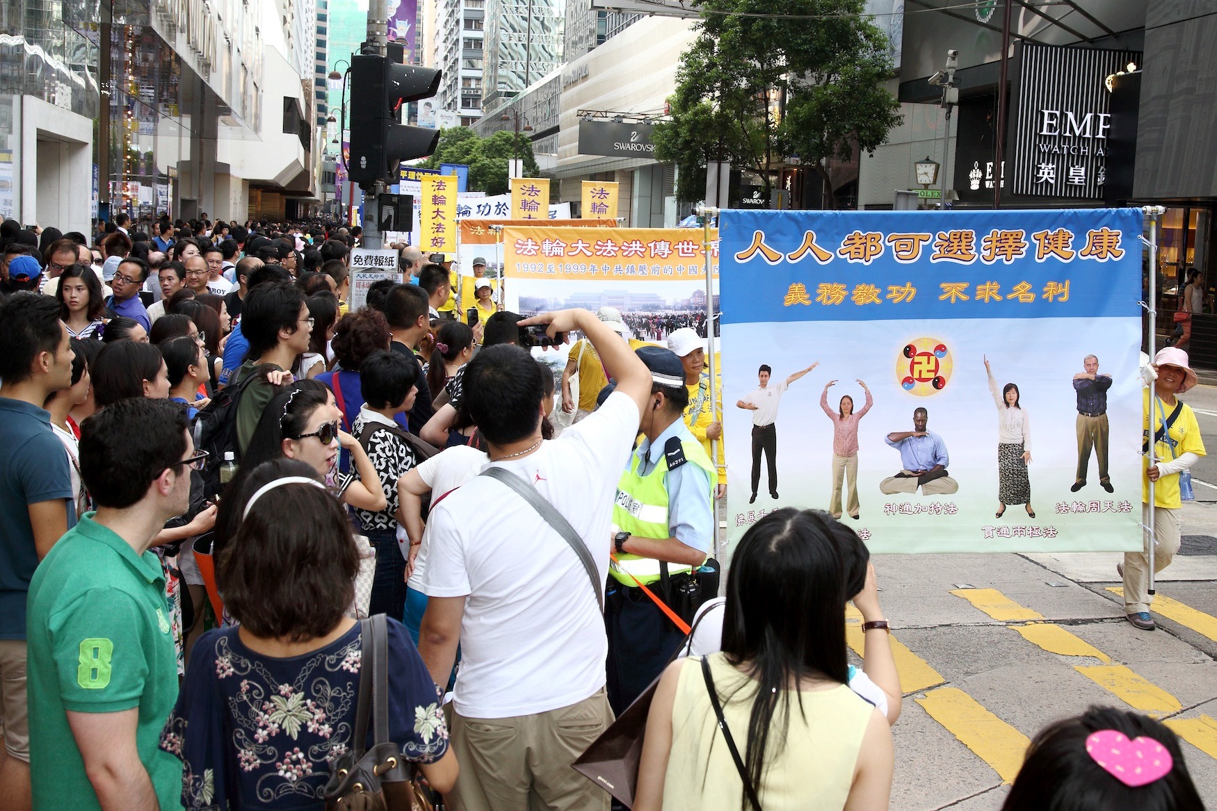 ![]() 图9-14:法轮功阵容庞大整齐的游行队伍吸引中西游客及港民驻足观看,纷纷举起相机、手机拍照。 |