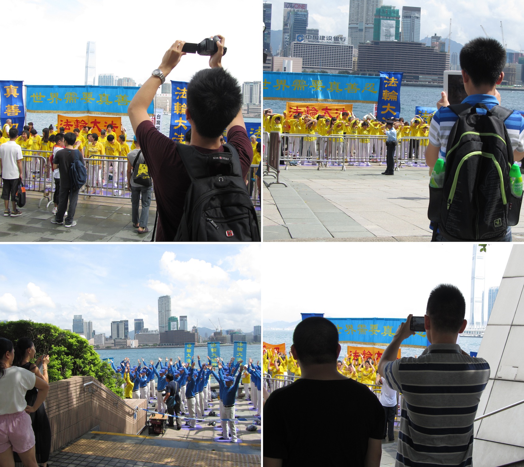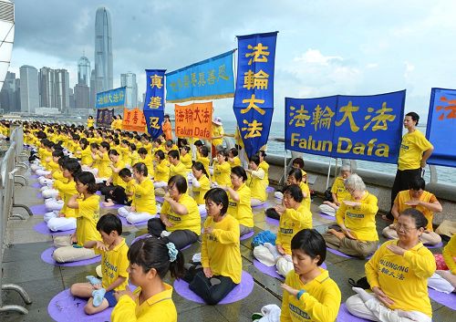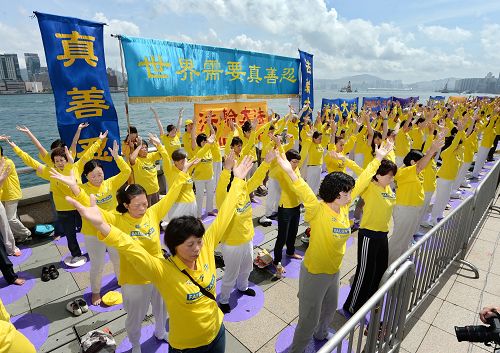 二十日当天,游行之前,上午九点多,数百名法轮功学员身着“法轮大法好”黄色上衣,齐聚湾仔金紫荆广场前的海堤岸旁大炼功,向世人展现法轮大法的美好,场面壮观。