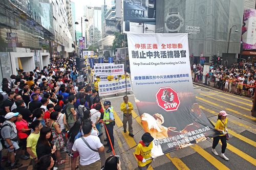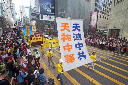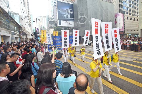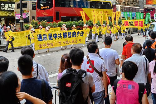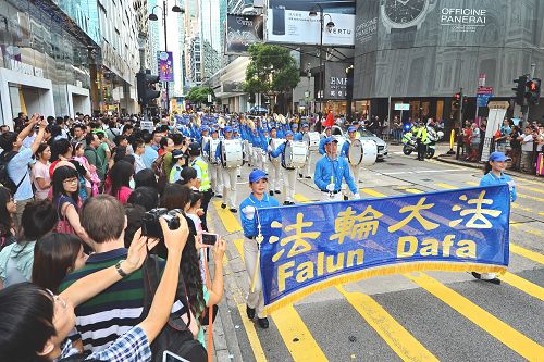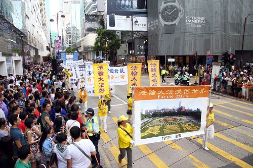 阵容庞大的游行队伍,由军威壮阔的天国乐团引领下,从长沙湾游乐场出发,沿着长沙湾道、弥敦道、广东道,途经旺角、佐敦抵达尖沙咀天星码头,历时约三个小时。沿途吸引行人、游客纷纷驻足观看或拍摄游行队伍及标语,“法轮功加油”的呼声不绝于耳。