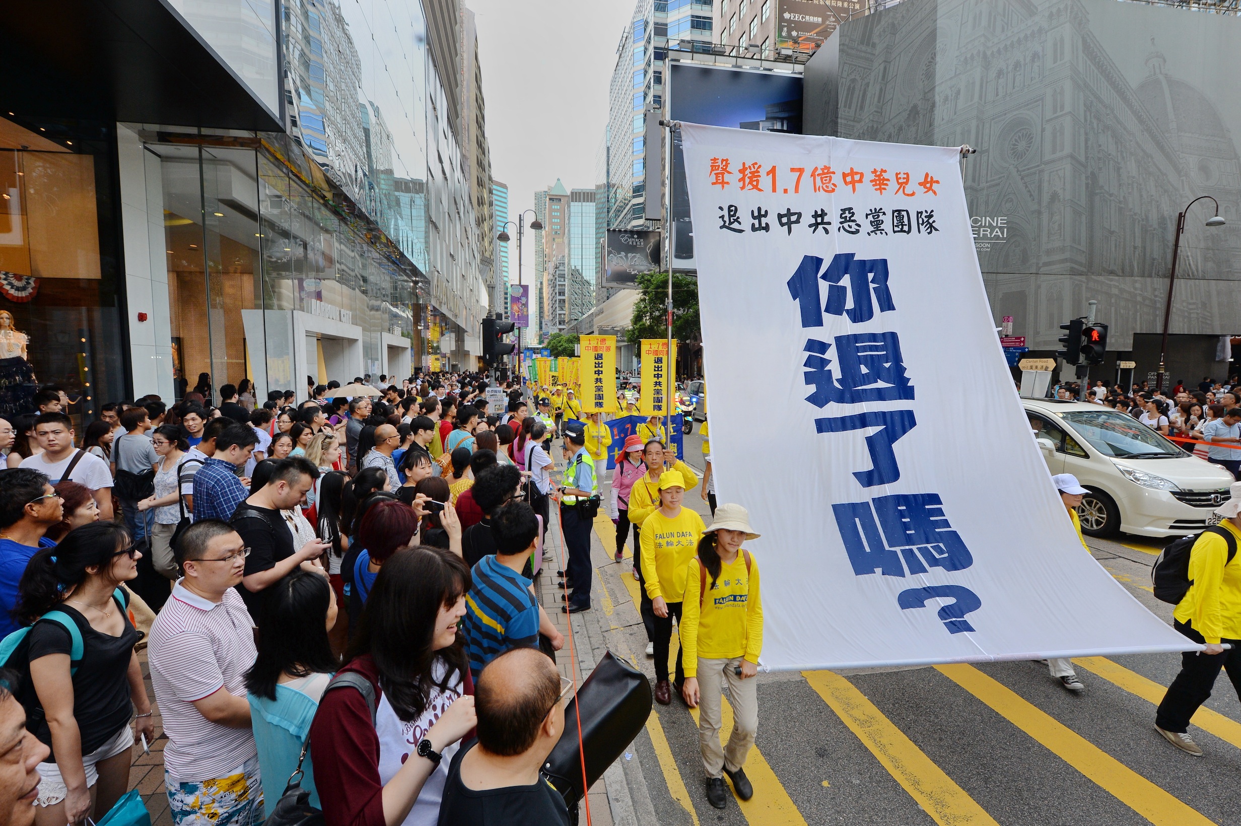 协助退!党!(退出中国共产党、共青团、少先队)的义工千慧和阿容都说:今天很顺利,帮助很多人退!党!,三言两语就退,有的一开口就说之前在国内、或其它地方(旅游景点)、或从网路上已经明白真相,主动表示要退,好几个是全家一起退。阿容说:“前面商业大街会有更多来购物的中国旅客,既然有缘看到我们的游行,就不能让他们错失救命保平安的机会,我要加把劲才行。”
