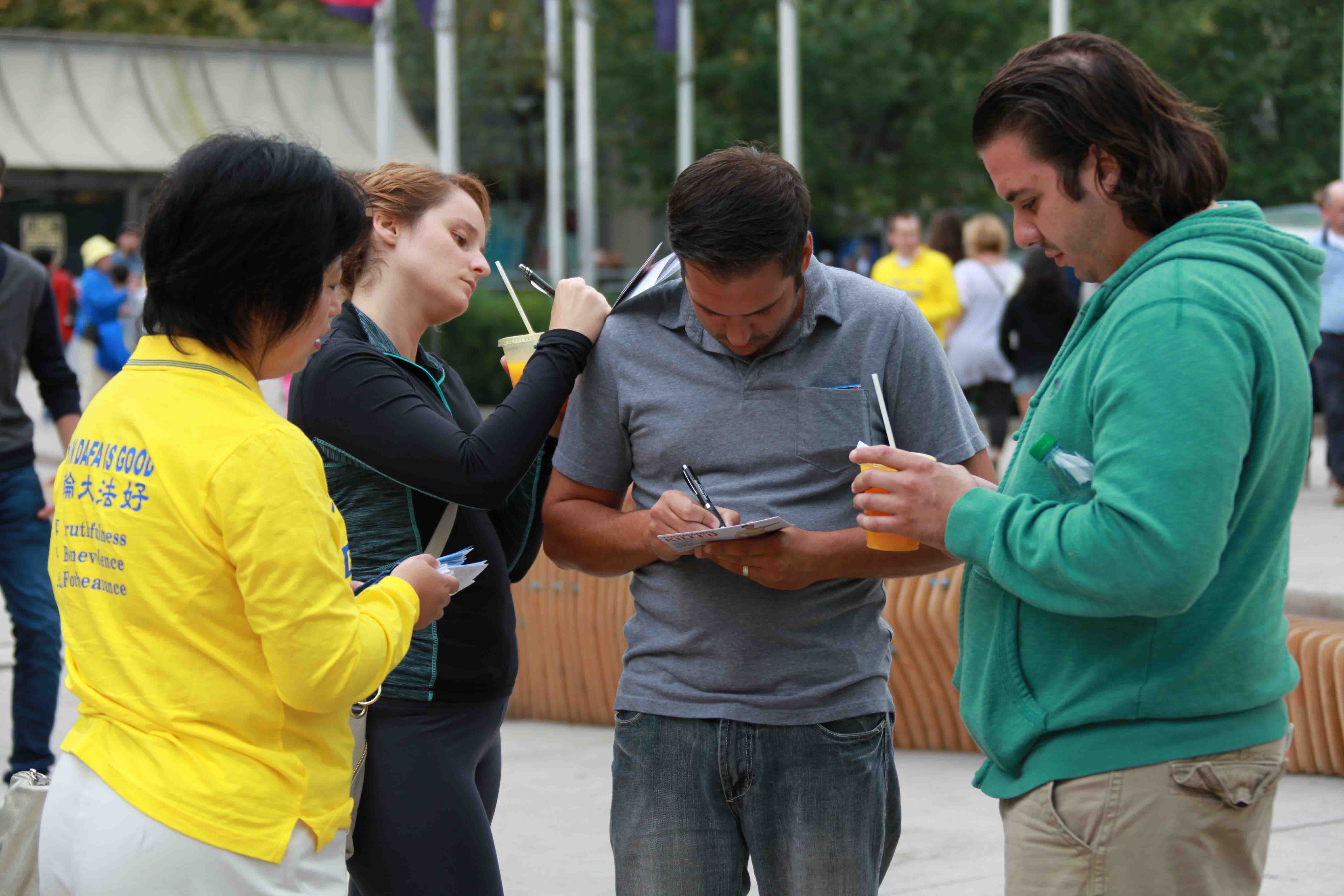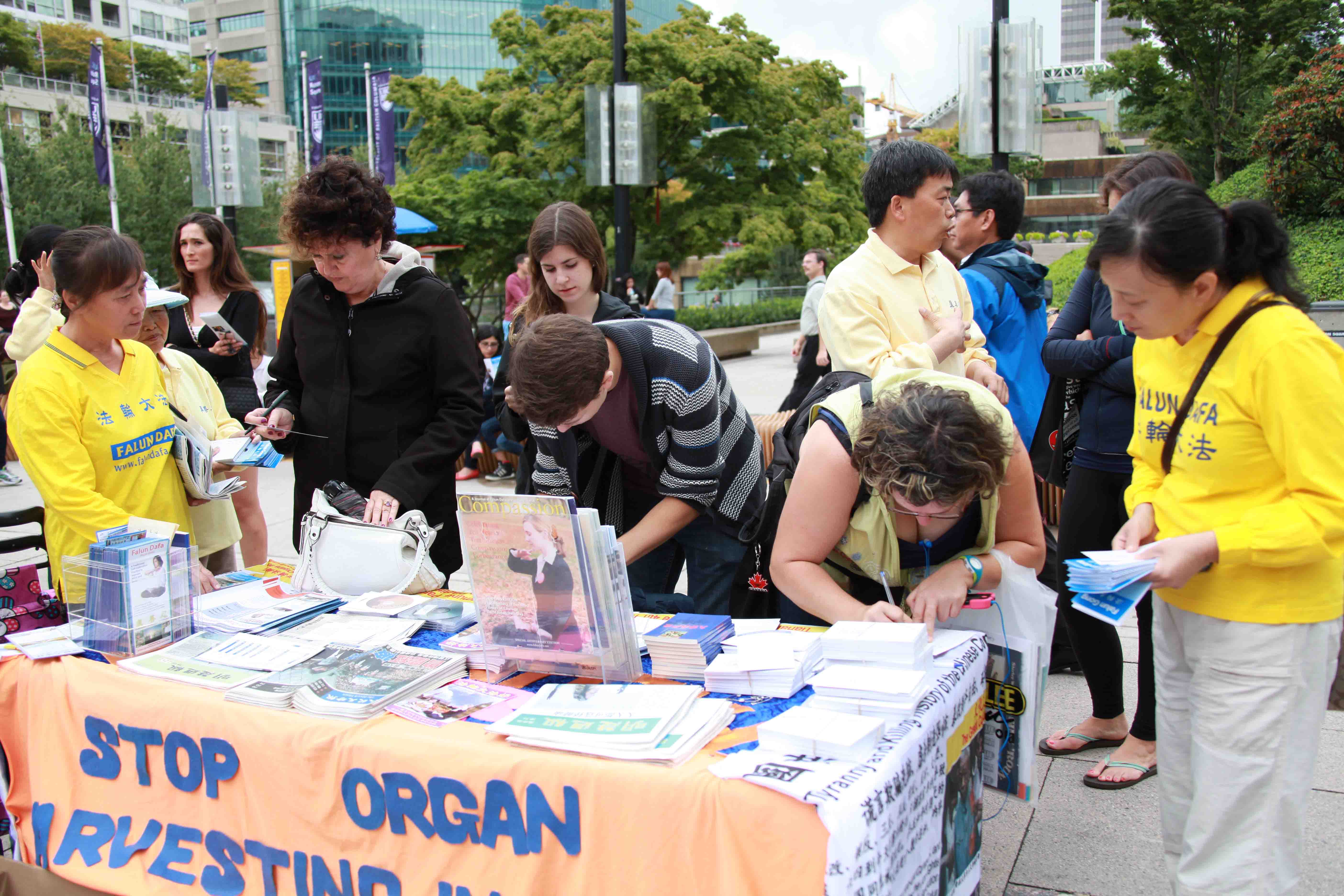 温哥华市中心艺术馆前广场是温哥华市中心最繁华的地段之一,过往行人川流不息。温哥华法轮功学员的大型炼功场面祥和宁静,吸引了很多人前来了解真相,并纷纷在呼吁加国政府立即停止中共对法轮功学员的迫害的明信片上签名,在几个小时内就收集到上千个签了名支持反迫害的明信片。有很多民众是一家人全部在反迫害明信片上签名。