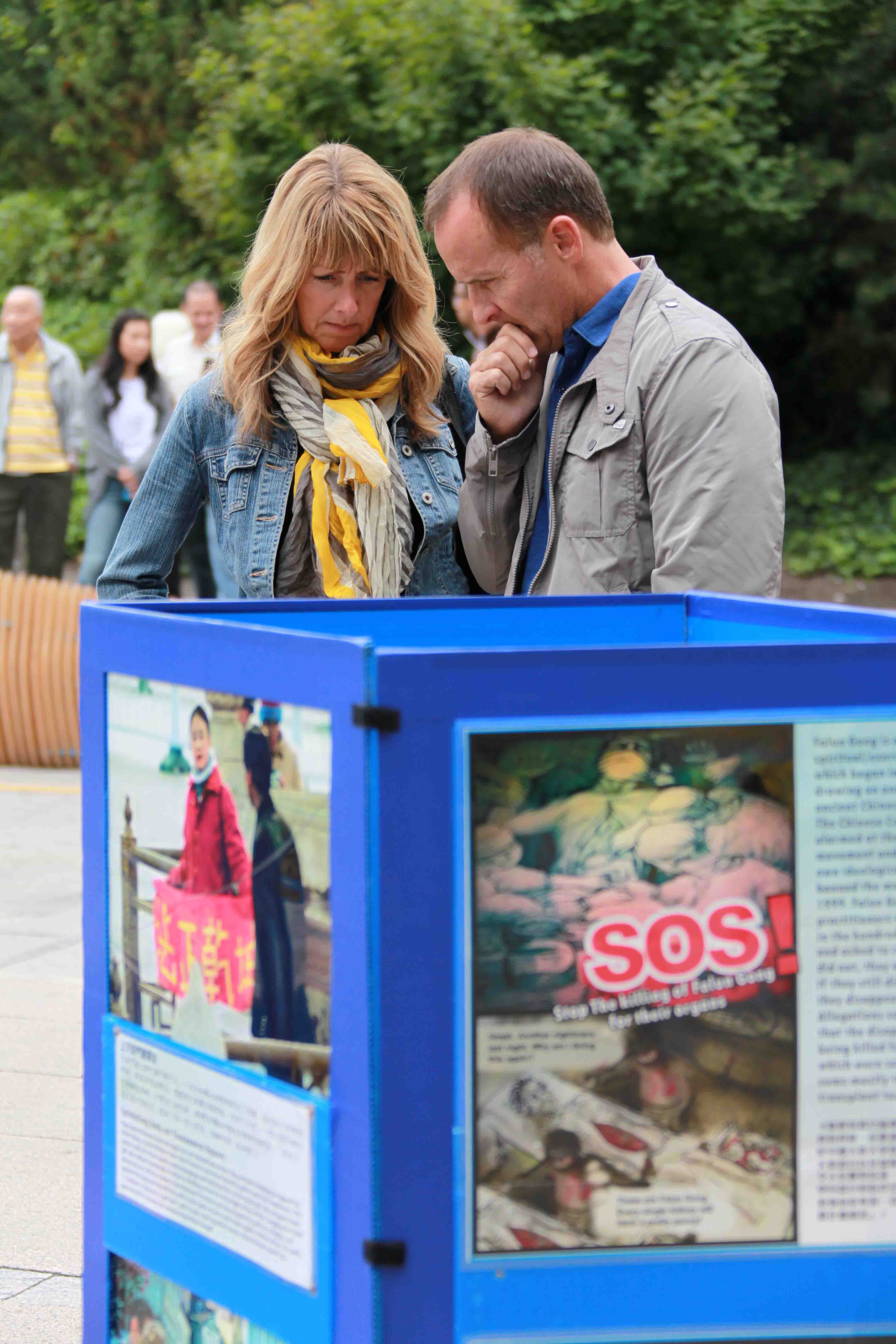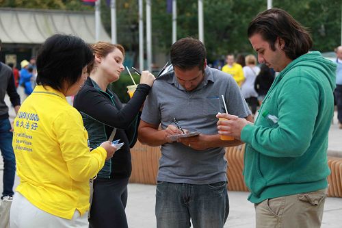 维特(Victor)先生是第一次有机会接触到法轮功,他认真地在呼吁制止中共迫害法轮功的明信片上签名。他表示,我能感受到法轮功学员们炼功时的祥和,尤其是配上音乐,我从来没有听过这样的音乐,这音乐能让我集中精力,唤醒我久远的记忆,我感觉到我被和(法轮功学员们)连接起来了,我知道他们炼的是佛法,我能感受到慈悲的力量。我觉得我的身体被清洗,坏的东西被清洗掉了,我的身体向好的方向在转变。这使我愿意留在这里,法轮功很好,可以使人身心受益。