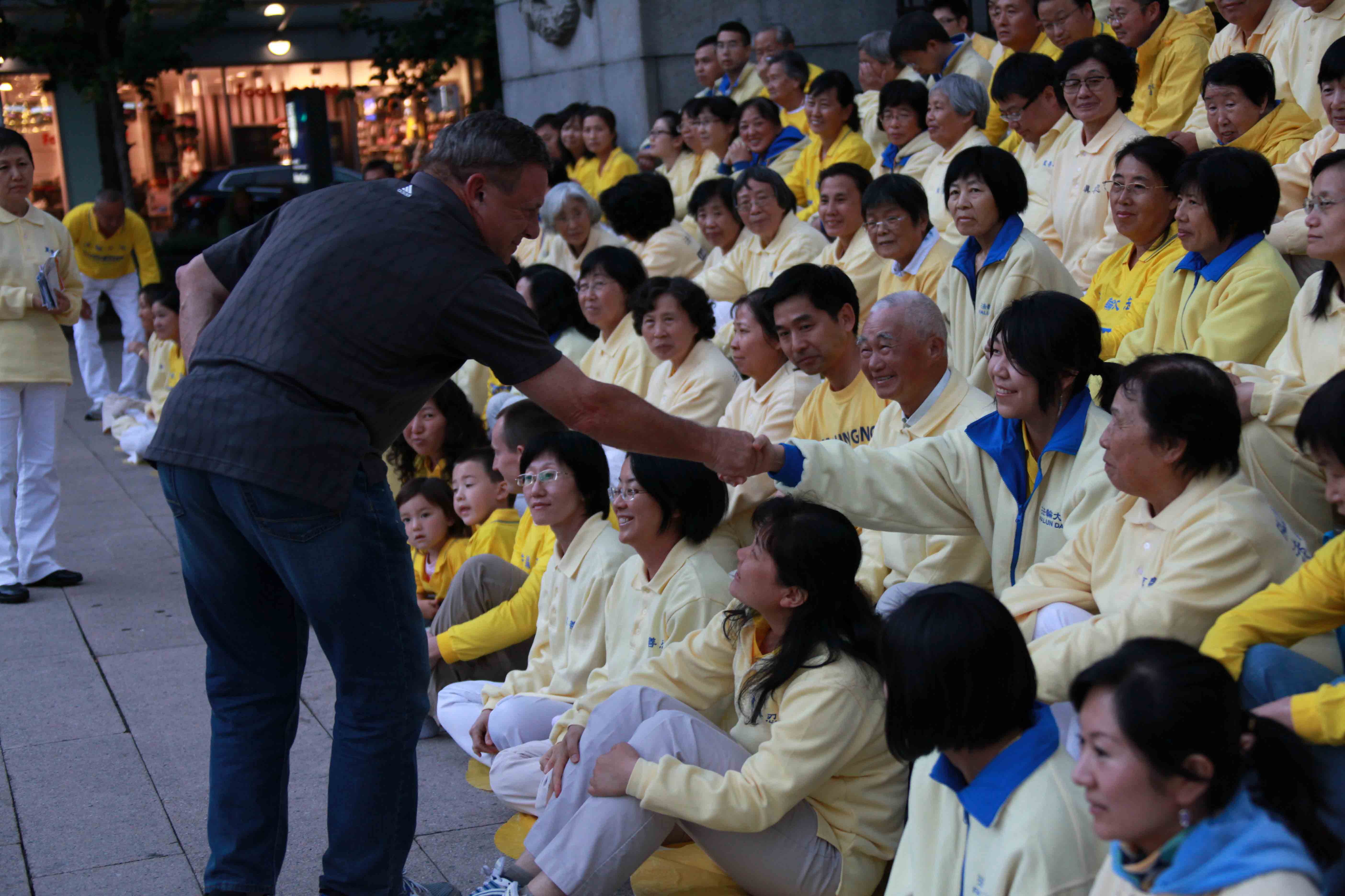 ![]() 图10:杰克•沃尔夫(Jack Wolff)与法轮功学员握手表示支持和祝福。 |