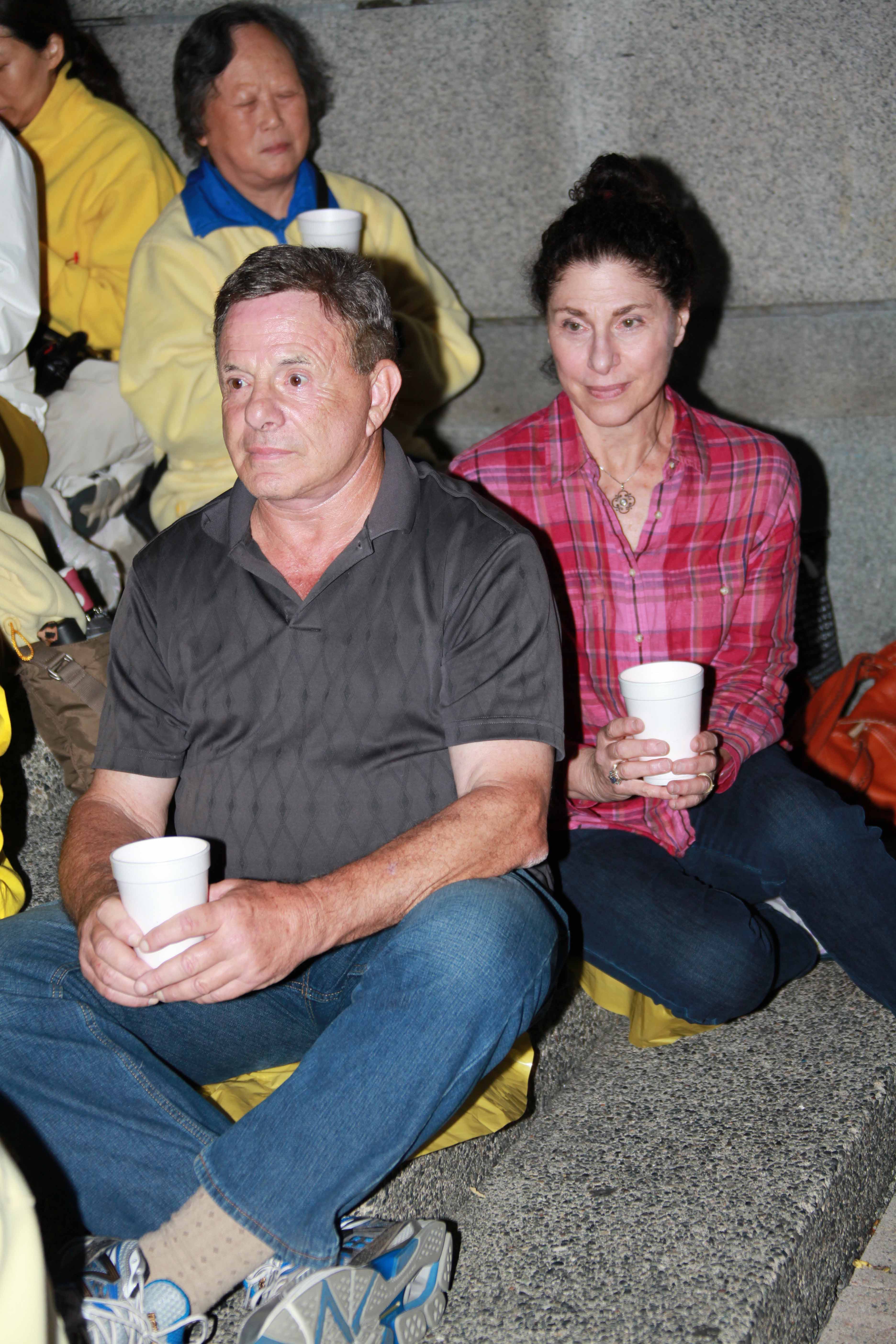 杰克•沃尔夫(Jack Wolff)夫妇是来自美国的游客,他们看到法轮功学员在准备烛光悼念活动,沃尔夫先生与前排的每位法轮功学员握手和击掌,表示支持和祝福。他表示,信仰自由不容剥夺。法轮功学员被迫害完全是无辜地,法轮功学员的反迫害是正义的合法的,我发自内心的支持,从历史的角度,从长远来看,法轮功学员的反迫害必将获得胜利。不管时日长短,你们必将获得胜利。我发自内心地祝福你们拥有美好的未来。沃尔夫夫妇主动加入法轮功学员的烛光悼念活动,手捧蜡烛与法轮功学员比邻而坐直到活动结束。