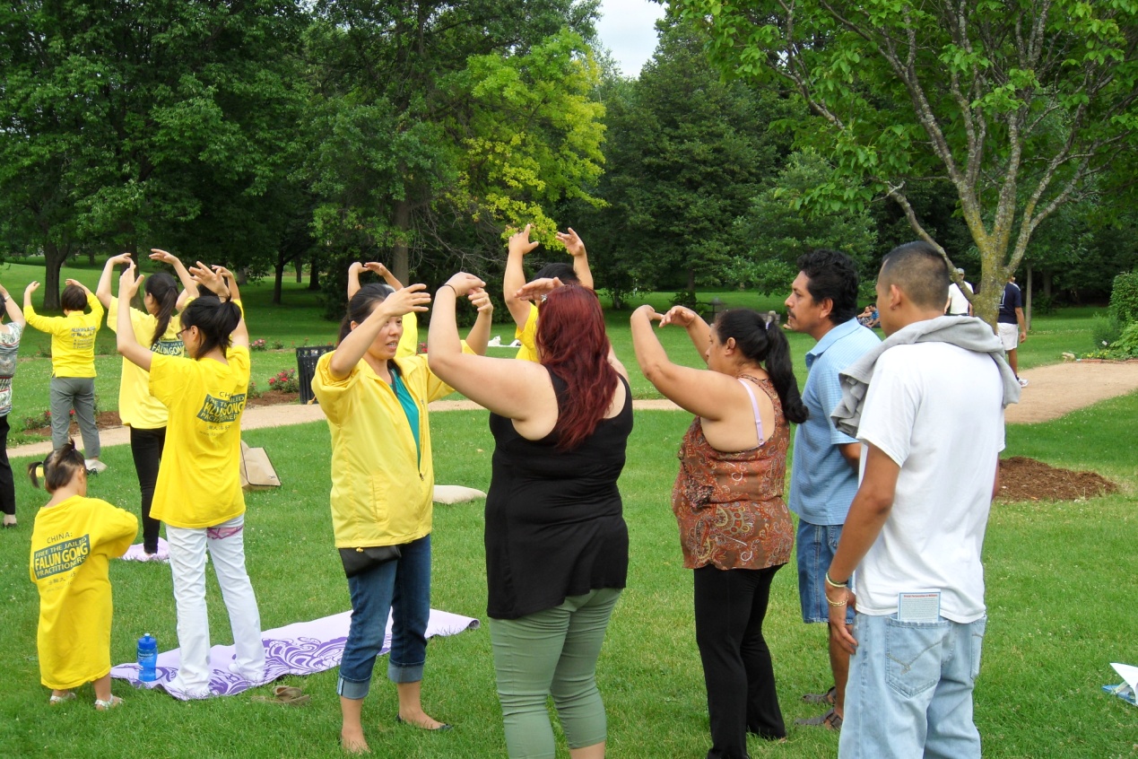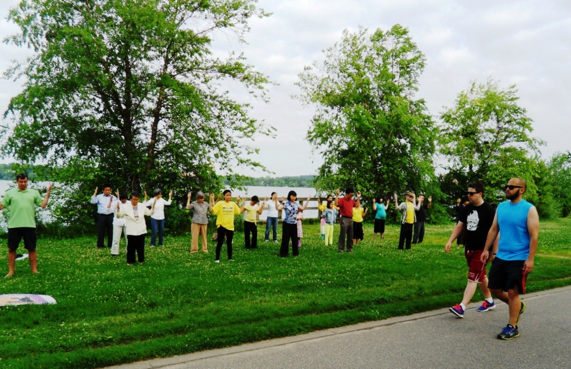 当天,明州的法轮功学员就象每个周日一样,来到卡尔霍恩湖畔的草地上集体炼功。卡尔霍恩湖是明尼阿波利斯市最大的湖,不少当地居民喜欢在这里晨跑、锻炼。每当优美的炼功音乐响起时,祥和的炼功场总是吸引了很多晨练者的目光。