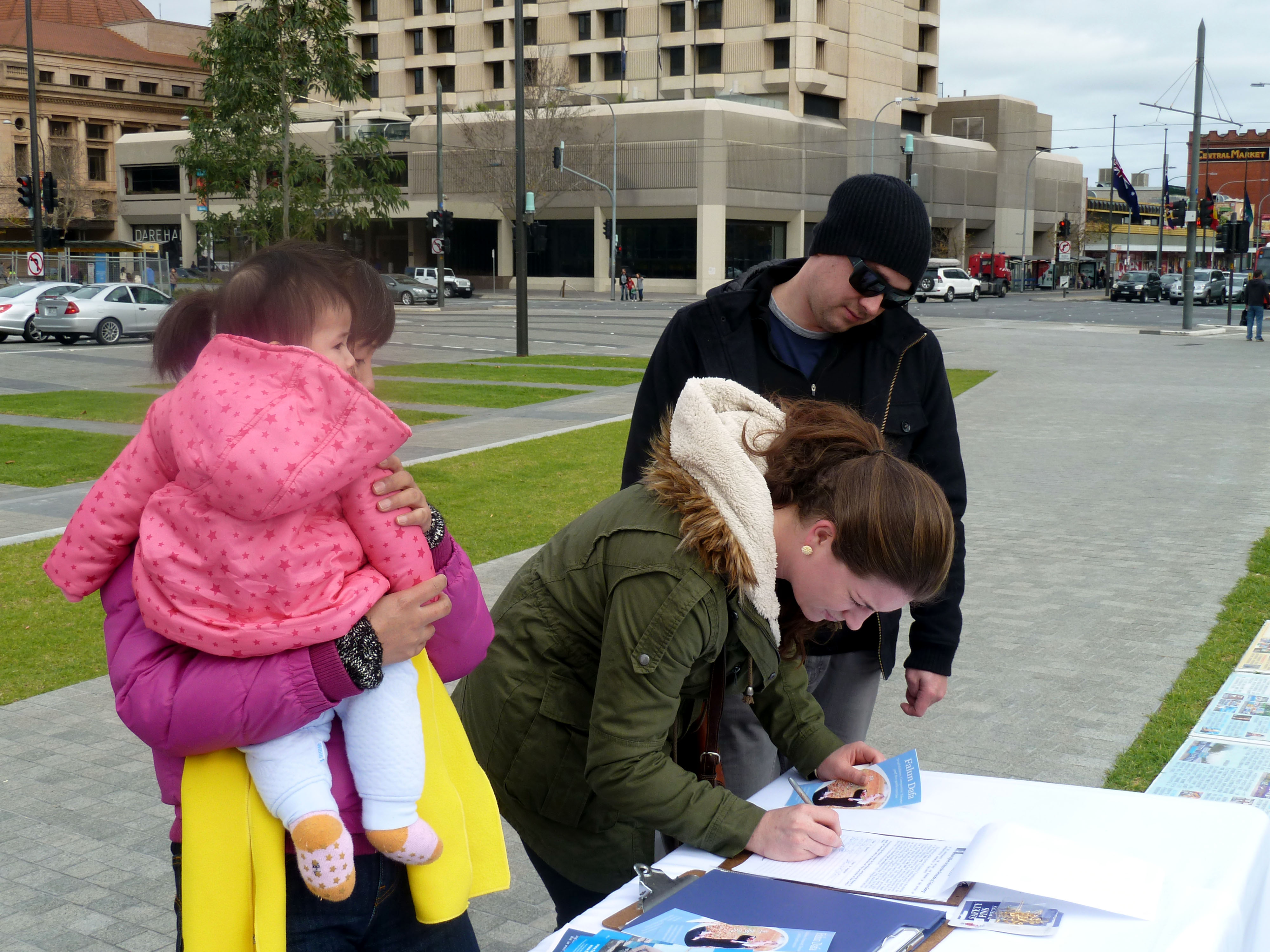 两位从墨尔本前来阿德莱德旅游观看赛事的年轻人威尔•法拉穆斯(Will Flacms) 和乔•弗雷泽(Joe Frazer)停下了脚步,弗雷泽先生是第一次听到法轮功学员讲真相,对中共迫害法轮功表示震惊。法拉穆斯先生说,在莫纳西大学等地有人给他讲过法轮功的真相,他也看到过墨尔本法轮功学员的反迫害大游行和天国乐团的表演,他自己喜欢中华传统文化和历史。他认为在国际社会呼吁,给中共压力是反迫害的好办法,继续曝光中共的罪恶,让更多人知道事实很重要。他俩都在制止迫害的征签簿上签名。